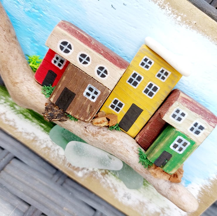 This stunning, one-of-a-kind piece of handcrafted driftwood art is perfect for anyone who loves all things coastal and appreciates reclaimed materials. It features a row of miniature coastal cottages, carefully crafted from driftwood, set on a base of driftwood with sea glass underneath to represent the ocean. Each piece has been meticulously hand-carved, painted, and mounted onto a backing of reclaimed wood, which has been sanded, painted, and varnished. Additional details like cork, twigs, and moss add the final touches, giving the design intricate and charming accents.