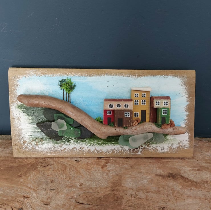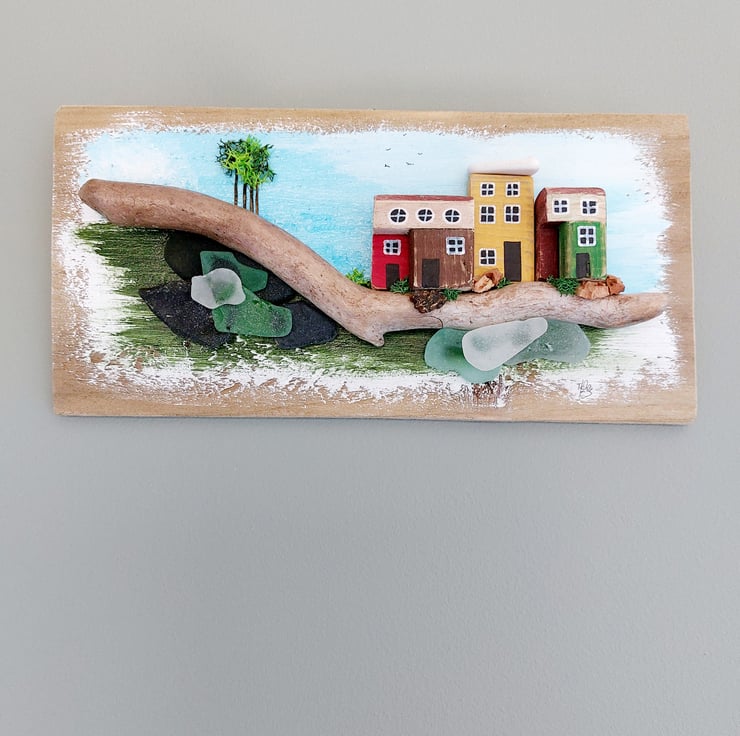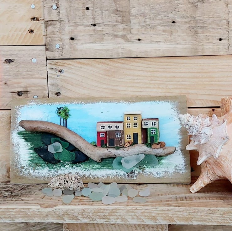 This stunning, one-of-a-kind piece of handcrafted driftwood art is perfect for anyone who loves all things coastal and appreciates reclaimed materials. It features a row of miniature coastal cottages, carefully crafted from driftwood, set on a base of driftwood with sea glass underneath to represent the ocean. Each piece has been meticulously hand-carved, painted, and mounted onto a backing of reclaimed wood, which has been sanded, painted, and varnished. Additional details like cork, twigs, and moss add the final touches, giving the design intricate and charming accents.