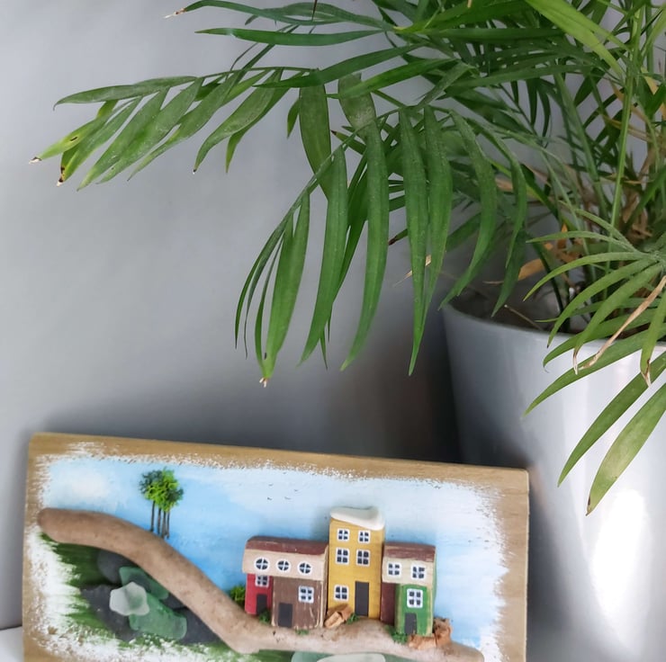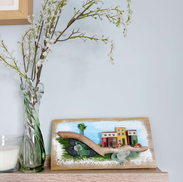 I began making miniature coastal scenes following a beachcombing trip to Morfa Beach in Conwy, north Wales. I was inspired by the colourful coastal cottages and the UK's smallest house that you can visit there. I also found an abundance of lovely chunky sea glass and pottery on the beach which I used in my early pieces, I have really enjoyed making them ever since that visit.