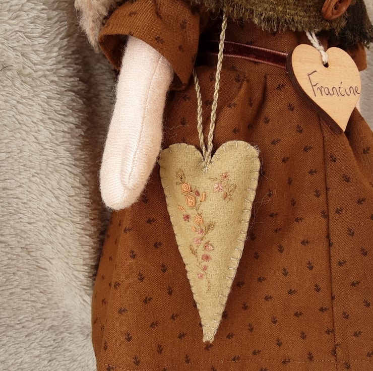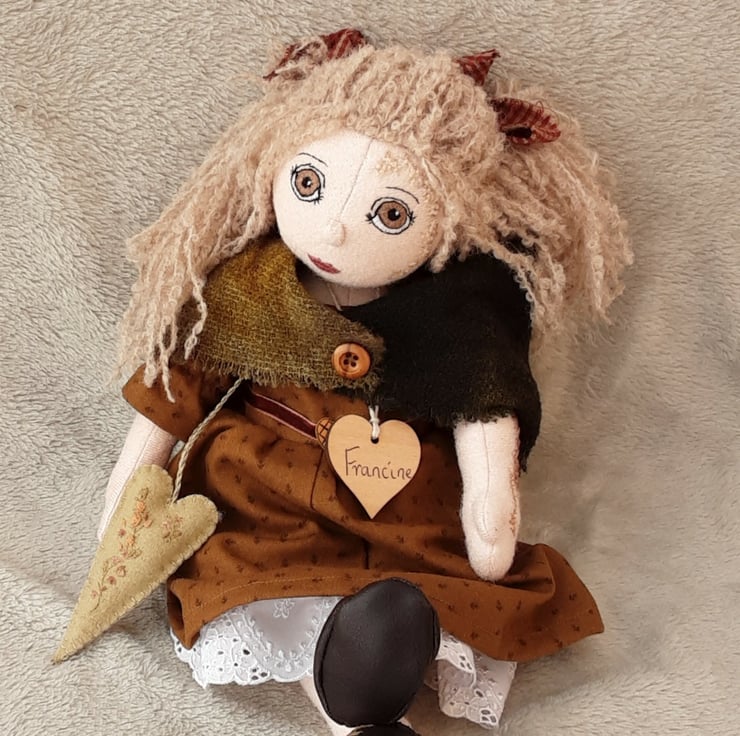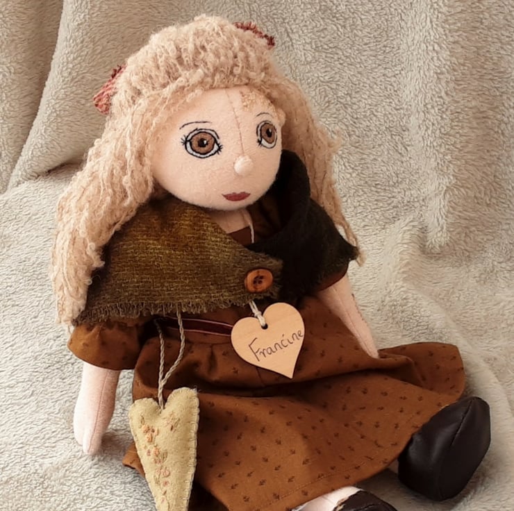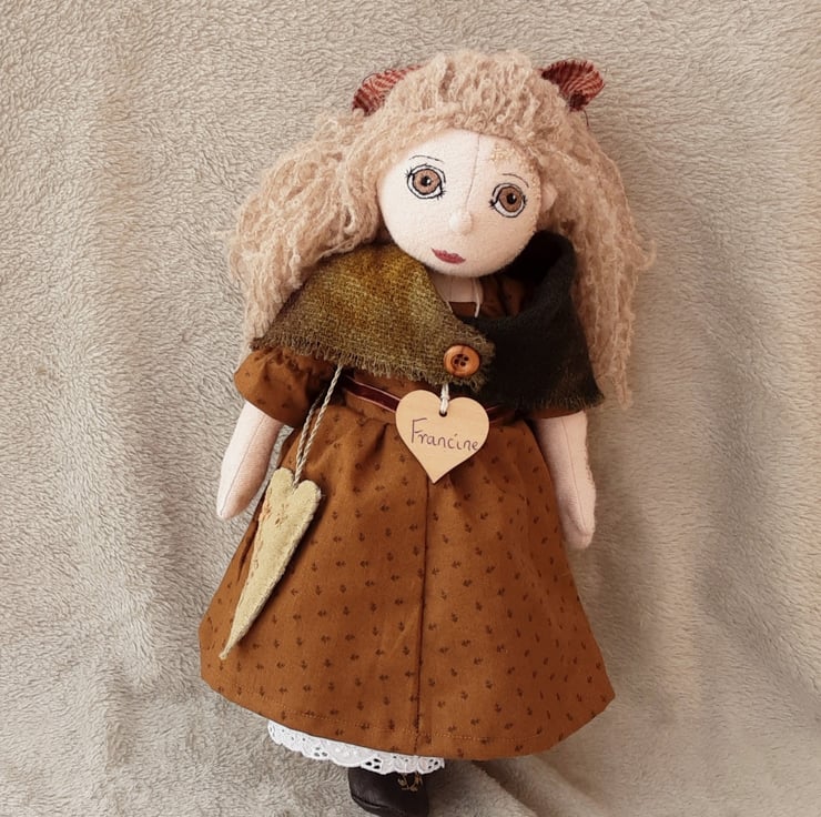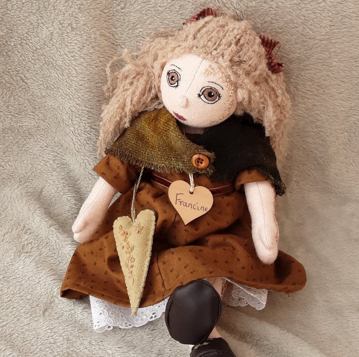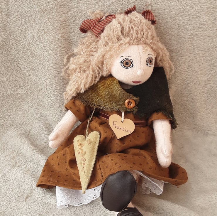 I love heritage styles, I had an image in my head of how I would like Francine to look and carefully selected fabrics, colours and trims to bring her to life. Doll making is a passion, I love all the little finishing touches that can be achieved when making the dolls. Their individual personalities and hand embroidered details, particularly the eyes which I spend many hours stitching, unpicking and restitching in order to bring her to life, the eyes are the windows of the soul.