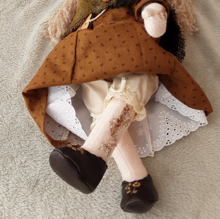 She wears long cotton pants in stone, edged with crochet lace and finished with little bows. Her dress took me a few attempts, made from a lovely rusty brown cotton fabric with ditsy print, little puffed sleeves, a ribbon to the waist and mock buttons to the back. She wears a white petticoat with lace edge and deep brown faux leather shoes which I have embroidered with tiny flowers.