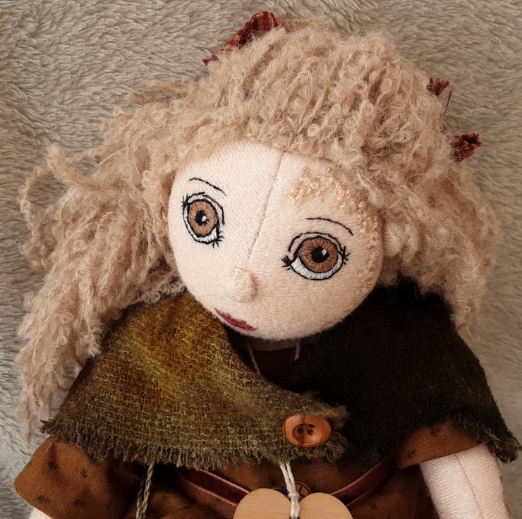 She has beautiful big brown eyes, I spent many hours hand stitching her facial features to achieve her individual personality then embroidered flowers to her face, one arm and leg in soft neutrals with added terracotta threads.