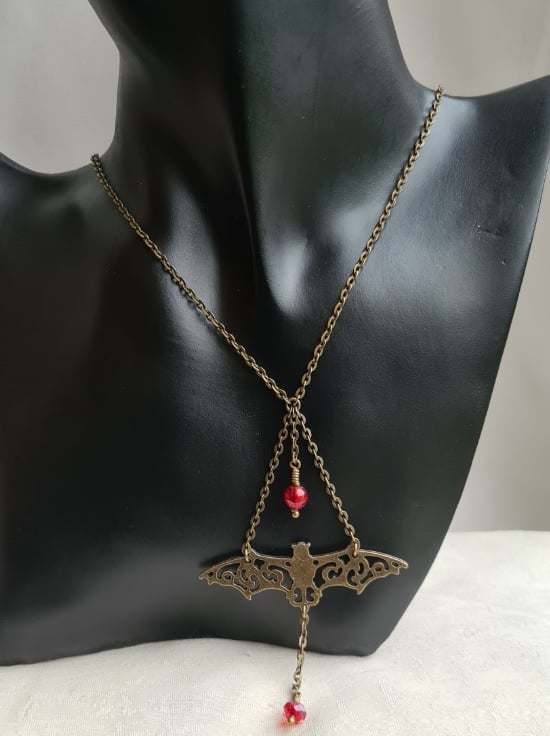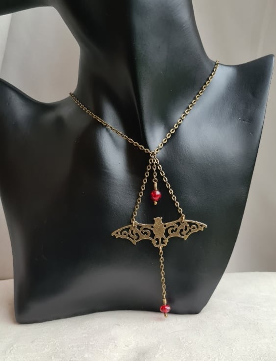 Chains are Antique Bronze tone iron cable chain and Fancy Bat charms are Antique Bronze tone metal Alloy. Beads are faceted Red crystal and round Red crackle beads.