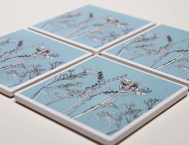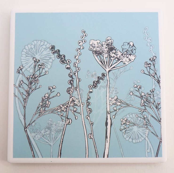 Set of four coasters featuring Cow Parsley and Seedheads on a pastel blue background.
