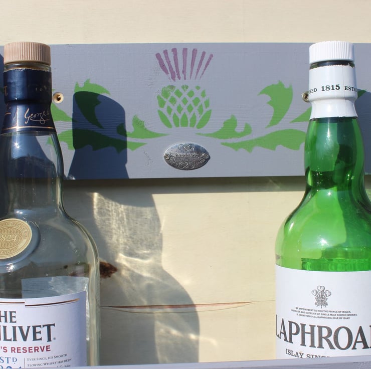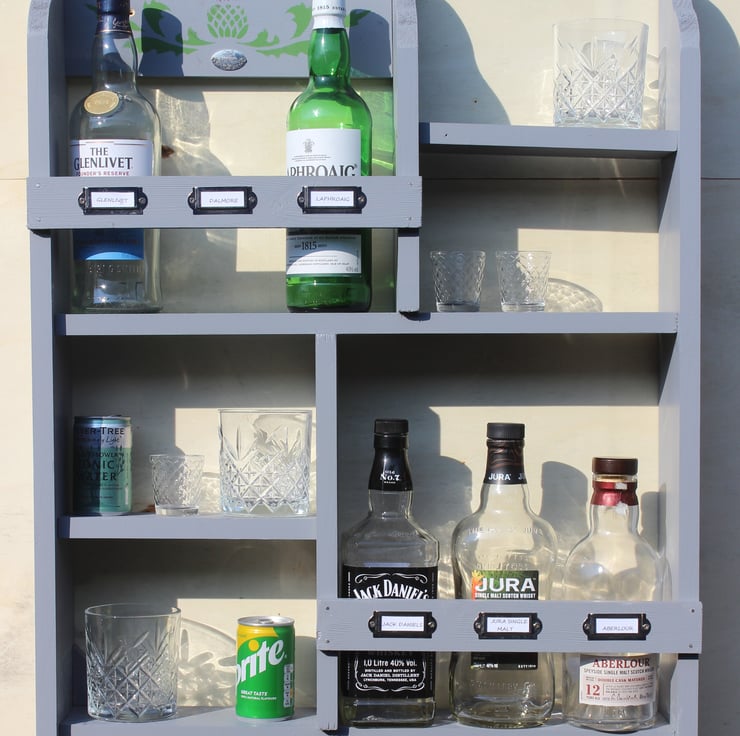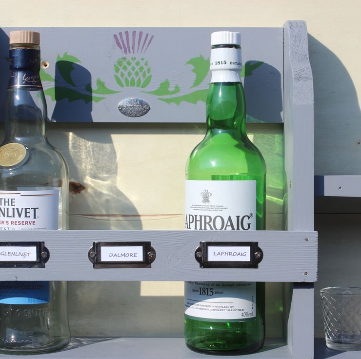 Hand made from new & re cycled wood. The wood has been painted with a Satinwood paint in Natural Slate colour. 6 chrome metal name holders are fixed to the front to list your favourite whiskies, with a thistle motif stenciled on to the painted wood.