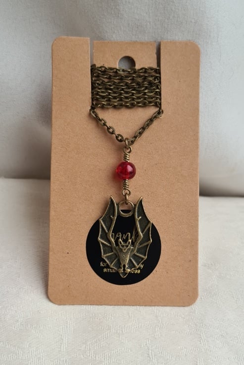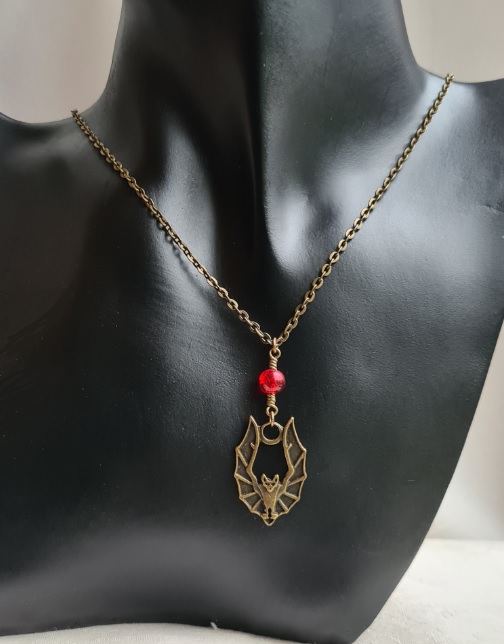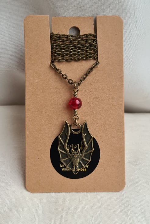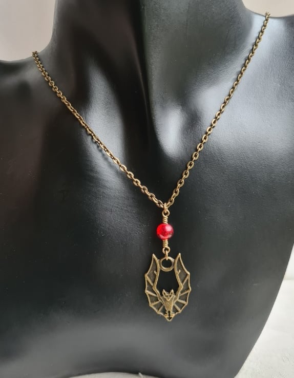 A fantastic Bat charm necklace in gorgeous Antique Bronze tones and with a Blood Red Bead. Great for those who love their jewellery with a little darkness.