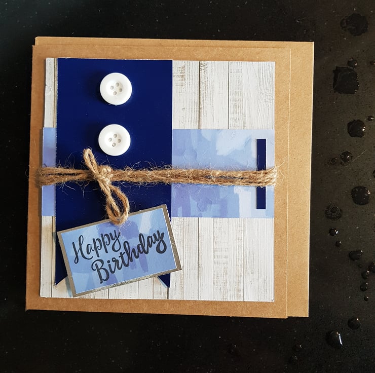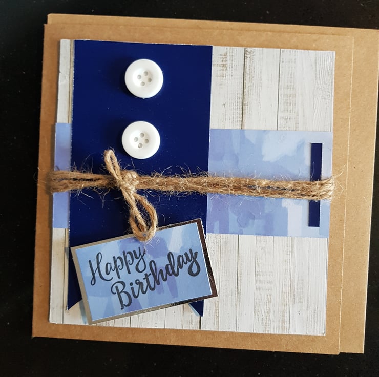 This card measures approx 6 x 6 inches and comes with an envelope. Its card base is Kraft Card for a natural look. It features a grey, wood panel background and a dark blue stripe with button detail and natural jute string. It has the wording 'Happy Birthday' on the front, in a 3d style, to make it stand out more. The card has an inner leaf, left blank, for you to write your own personal inside.