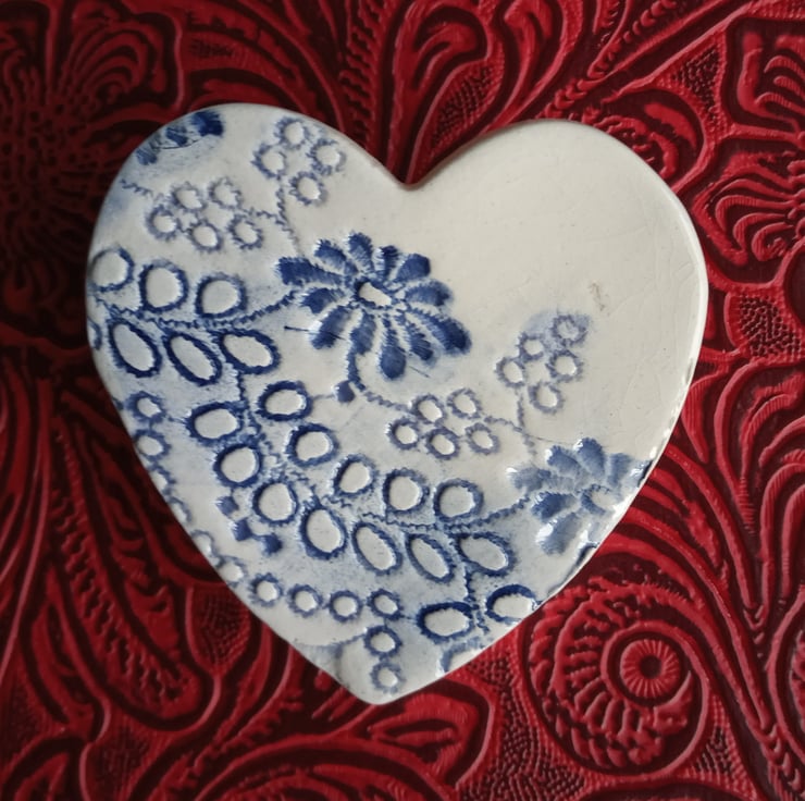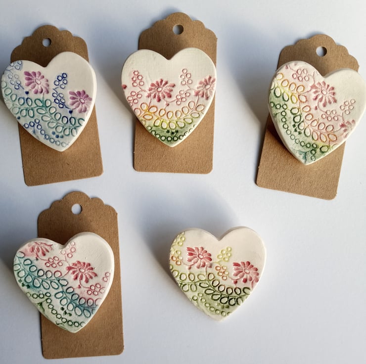 These lovely imprinted flower brooches are all unique in the way I glaze them. The brooch is approximately 5cm x 5cm so a nice bold piece of jewellery. This is a series of brooches so the colours and texture may vary slightly as in the pictures but each one is a lovely piece of artwork
