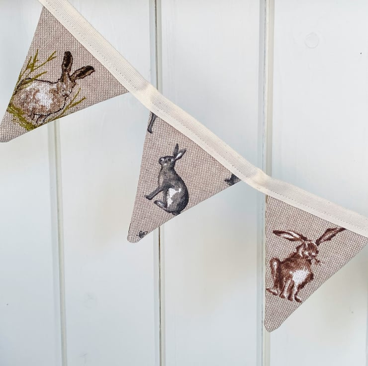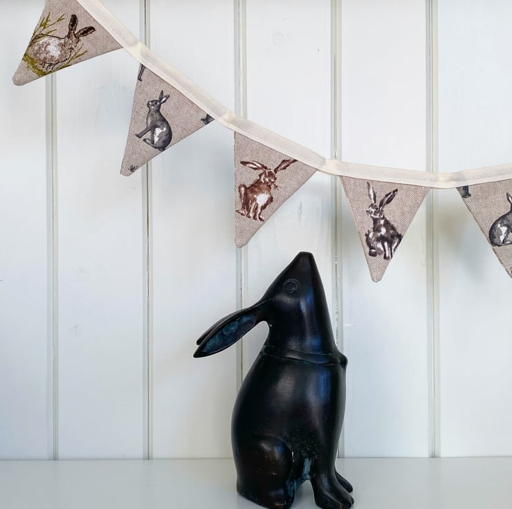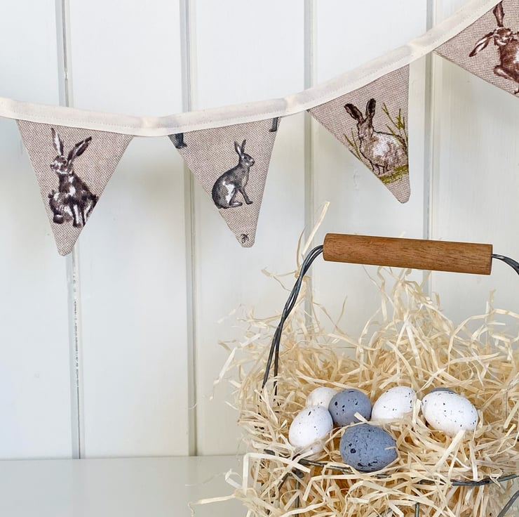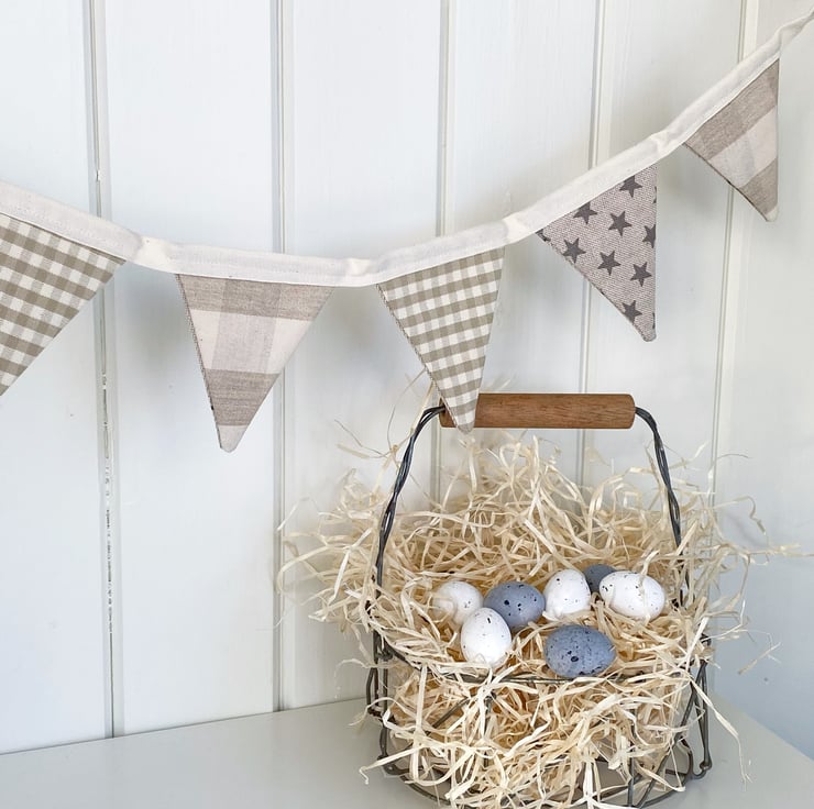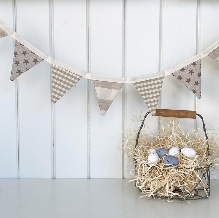 Assorted grey and brown Easter Bunnies adorn one side of this handmade fabric bunting. The reverse side is a mix of neutral checks, gingham and stars (which can be displayed any time of year!) All securely sewn onto cream cotton tape.
