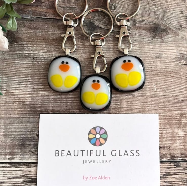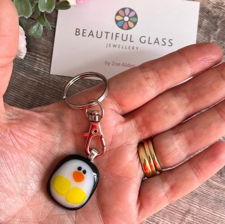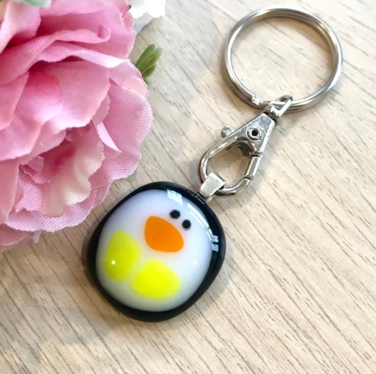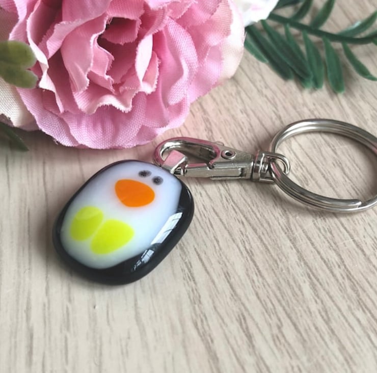 Individually handmade by fusing tiny pieces of glass together, so each penguin is unique and may differ slightly from the photo. It comes on a split ring with a keyring trigger.