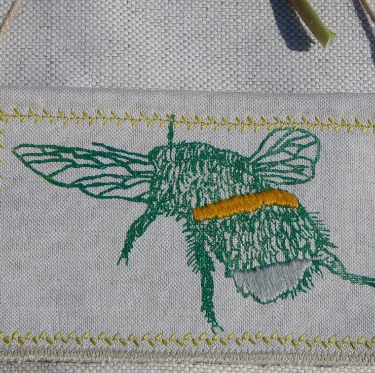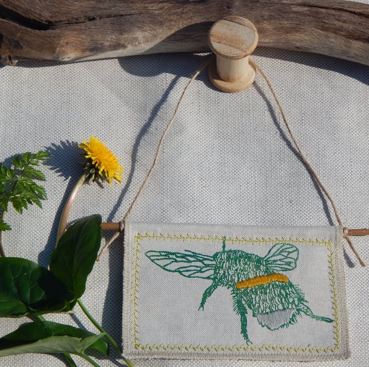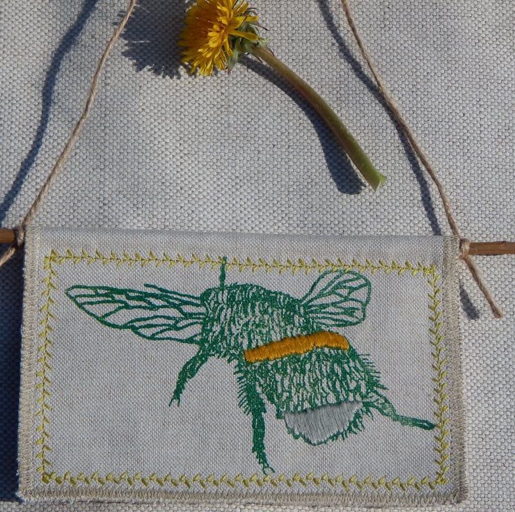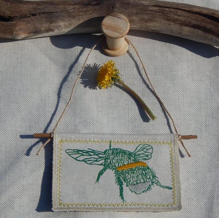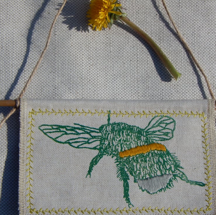 This is a bee screen printed onto a beige medium cotton. The yellow and grey bee bands have been hand embroidered. This has a couple of layers of cotton fabric for some stability and this is sewn onto a piece of willow, a simple hanging loop is made with a piece of hemp string connected from one end of the willow to the other.