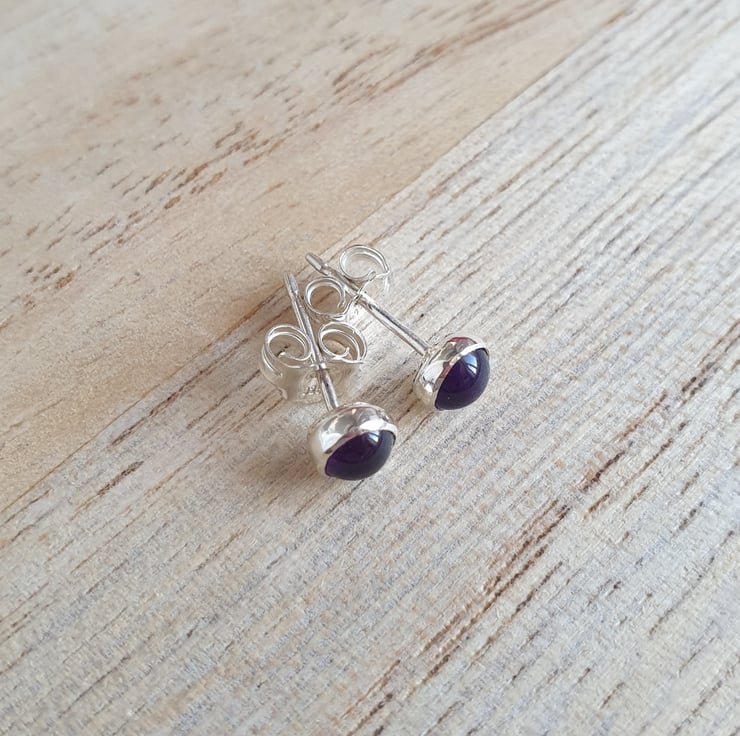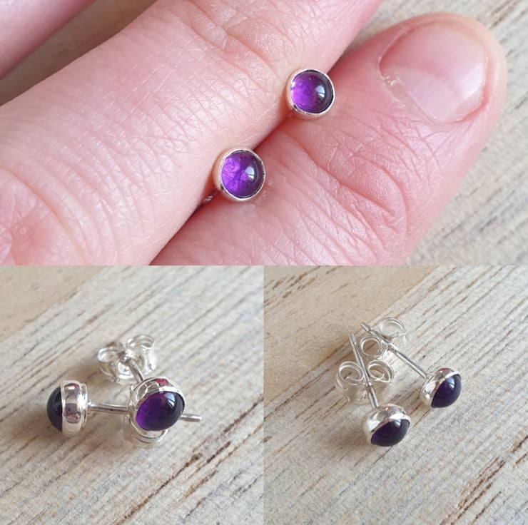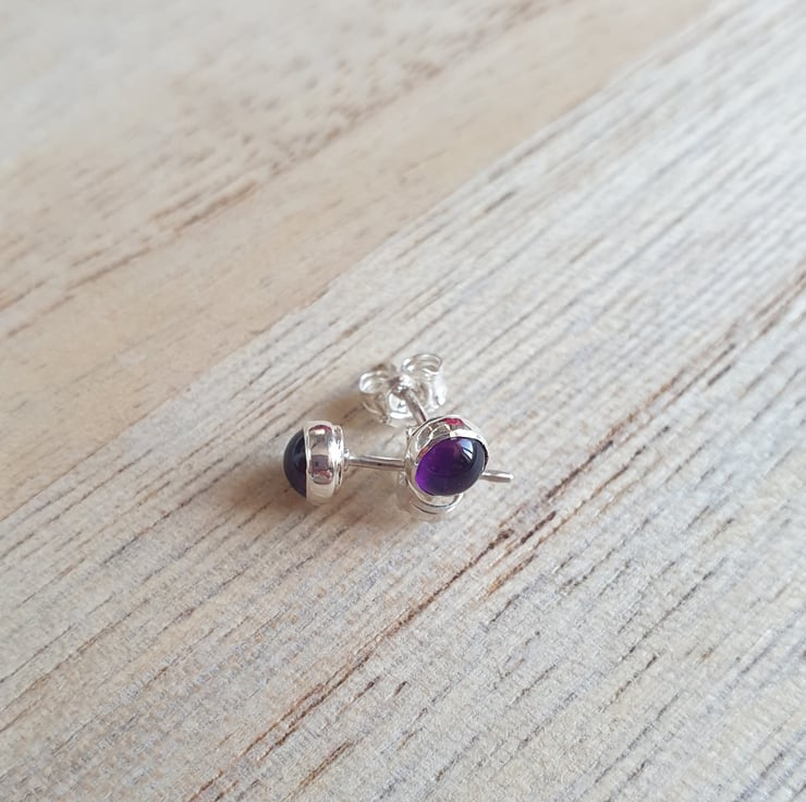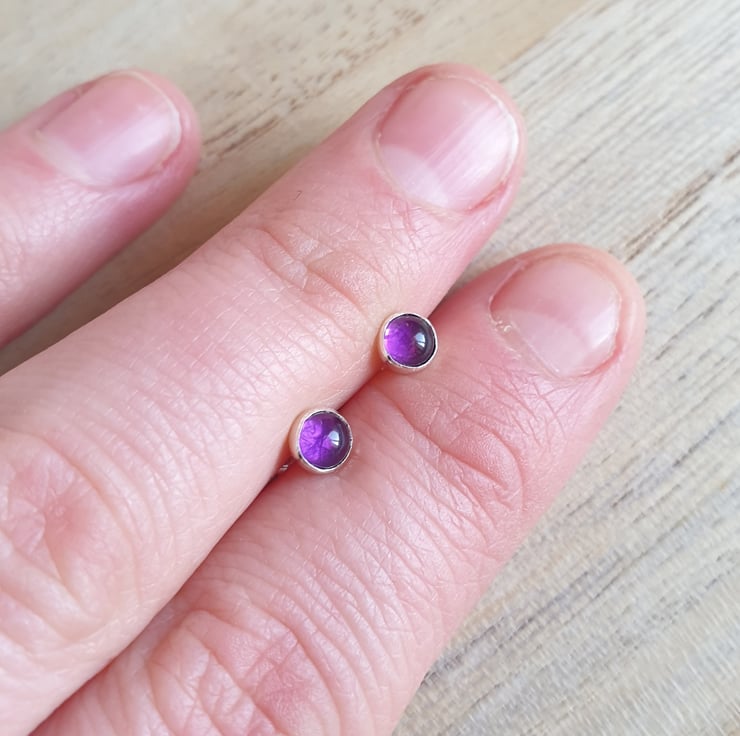 Sterling silver stud earrings featuring beautiful 4mm cabochon cut amethyst stones which appear to glow when any light source hits them. Amethyst is said to reduce stress, improve sleep and enhance sobriety, in fact the name Amethyst comes from the Greek word ametusthos which means ‘not intoxicated’. Amethyst is also the birthstone for February.