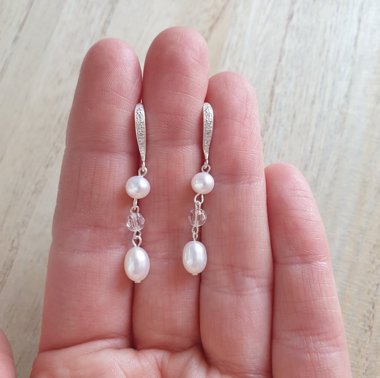 These earrings measure approximately 2.5cm in length. The bottom pearls are approximately 5mm x 6mm and the top pearls are between 3 and 4mm.