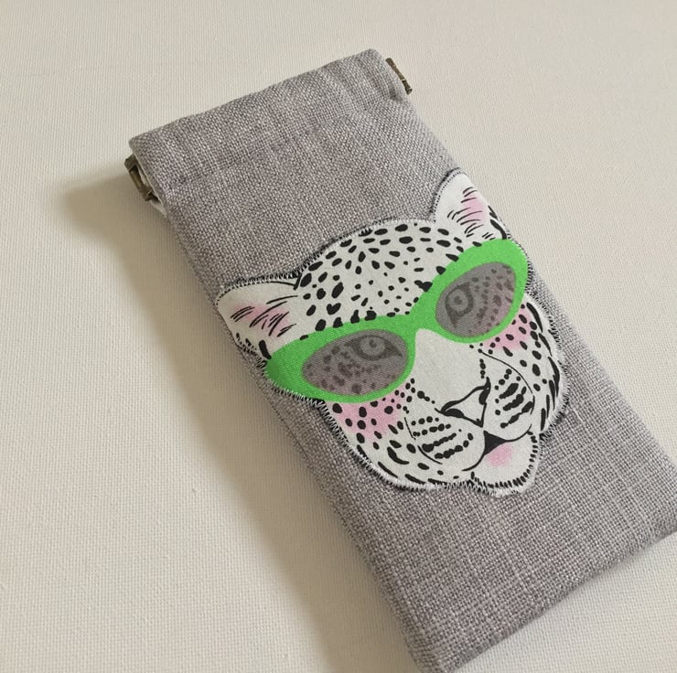 Snap shut glasses case with an appliquéd animal sporting sunglasses! Lined with a foam stabiliser and a cotton lining to keep your glasses safe from scratches.