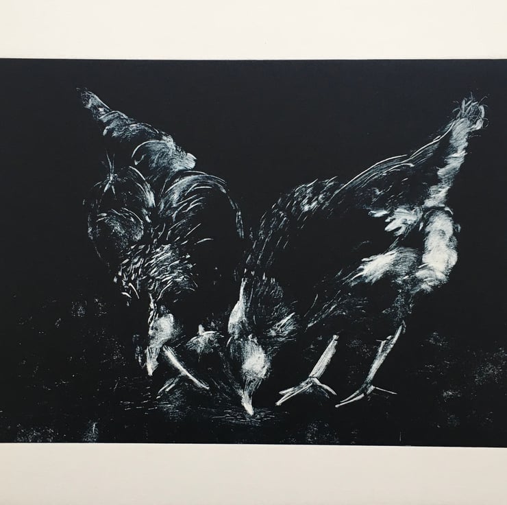 A4 subtractive monotype, Blue/blackCaligo relief ink on heavy cartridge. Mounted in acid free card In a white wood frame.