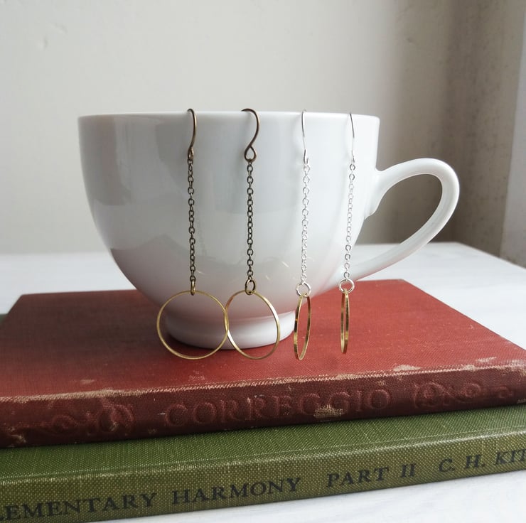 Beautiful modern brass hoops on long bronze chain. Perfect minimalist jewellery.