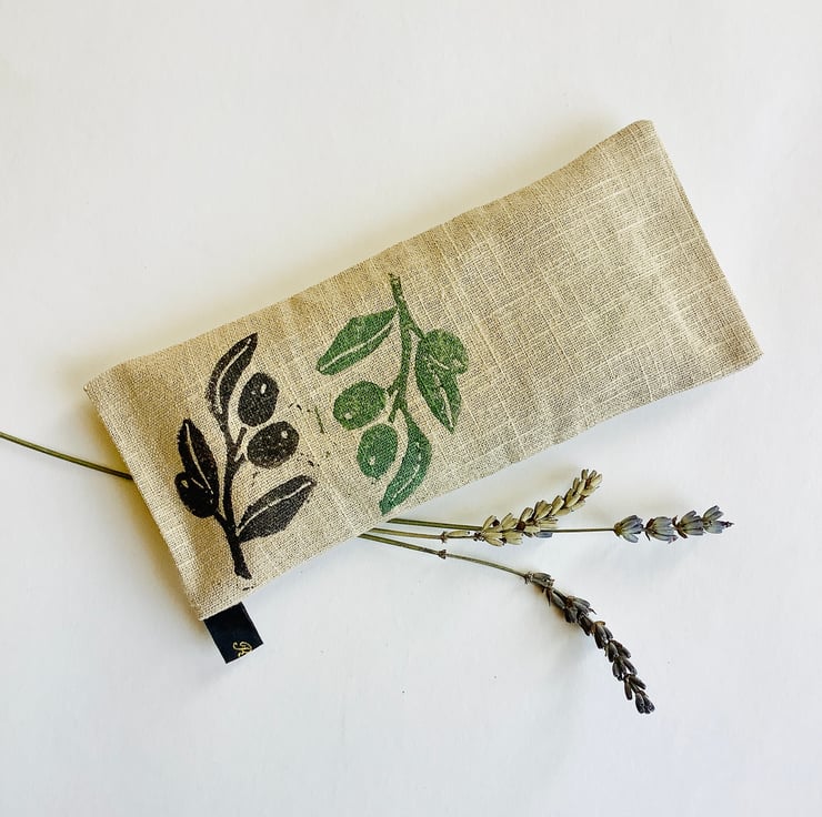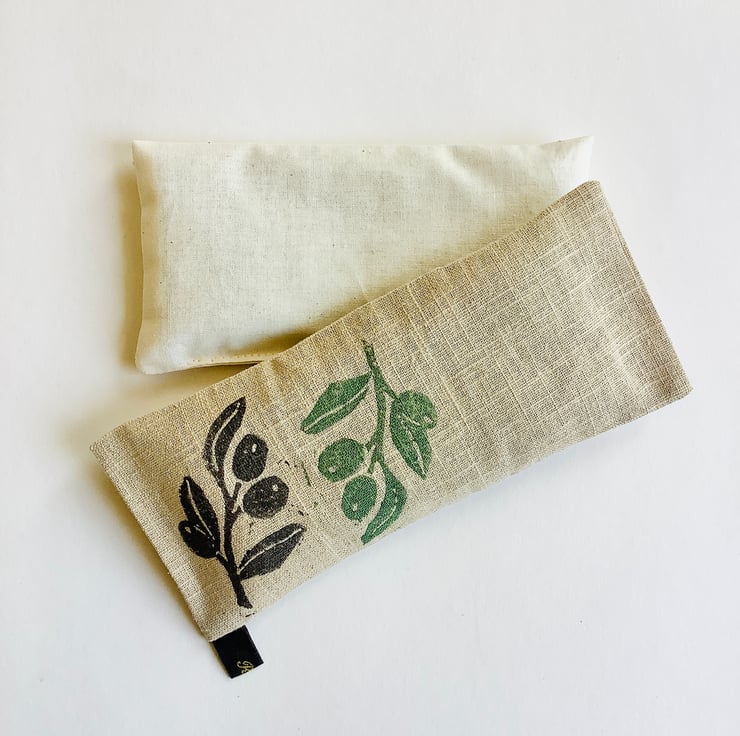 Eye pillow hand printed with an original linocut designs using eco friendly inks on to natural 100% linen