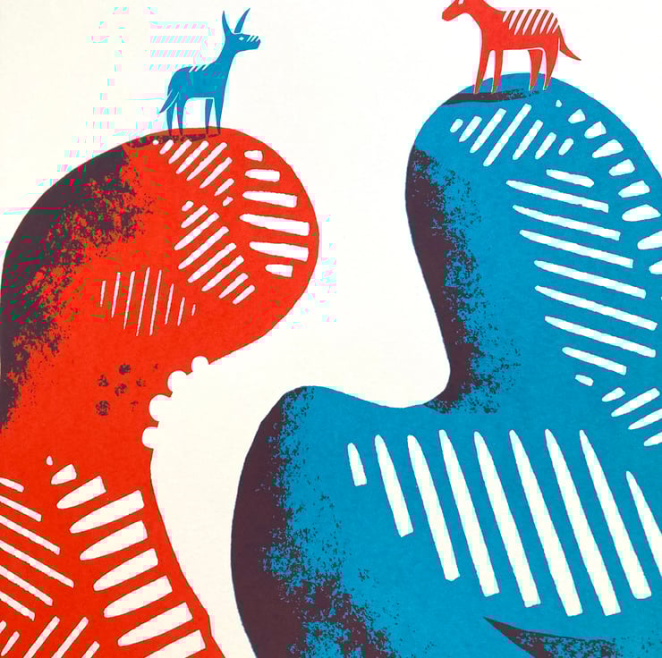 This print is another follow-up to my first series of 'donkey monolith' compositions, in which donkeys explore a sculptural landscape. For this print I just had a simple idea in my head of a red donkey and a blue donkey exploring monoliths which are oppositely blue and red! It makes sense in my head, honestly.