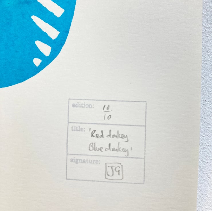 Bright red and bright blue ink on Antique White Seawhite 280gsm acid-free paper. From an edition of only 10, signed, stamped, titled and numbered.