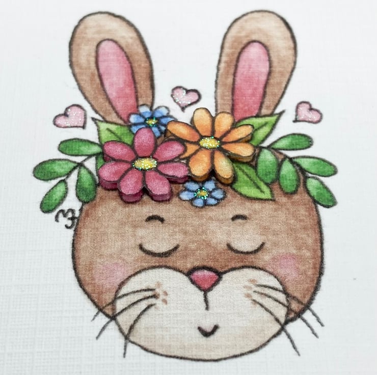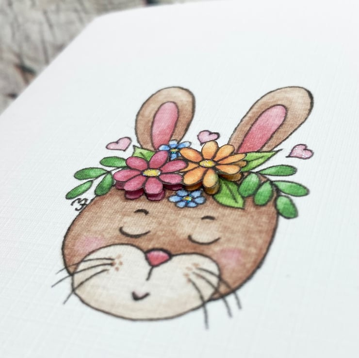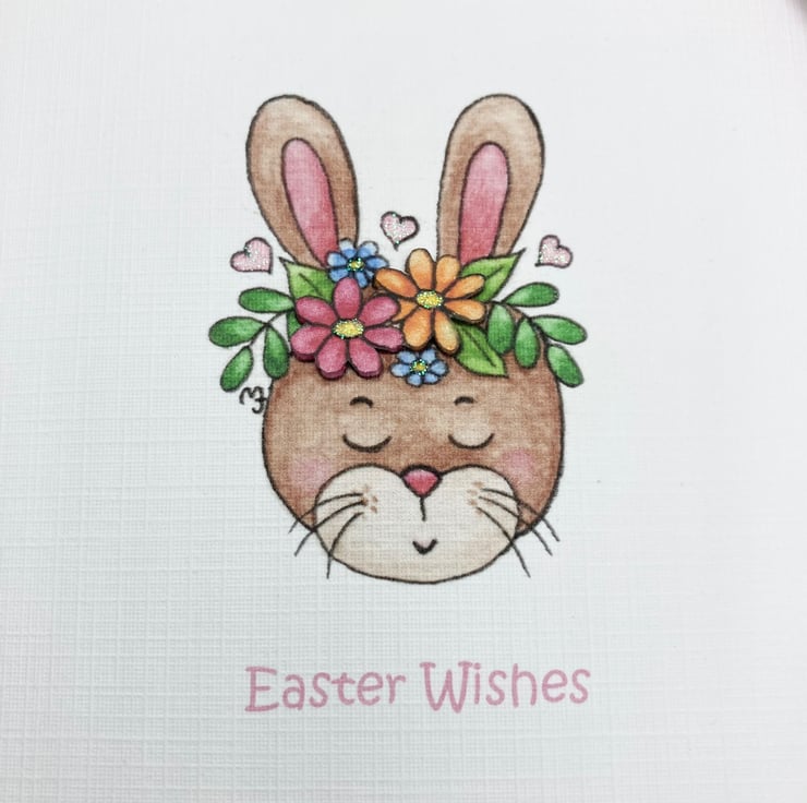 This cute Bunny card has been designed using my own original illustration. The image has been printed out onto good quality white linen embossed card and decoupaged up in parts. I have also added a little glitter detail.