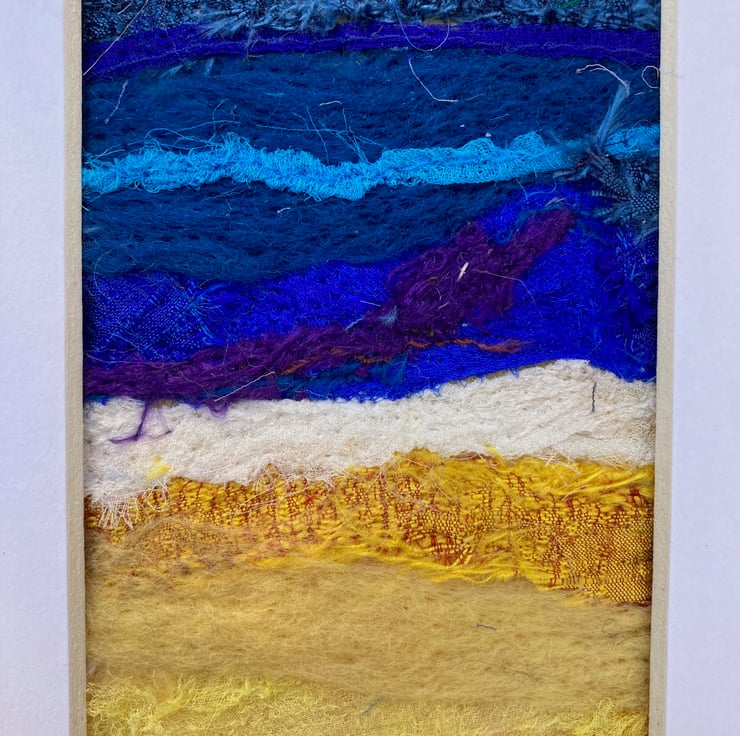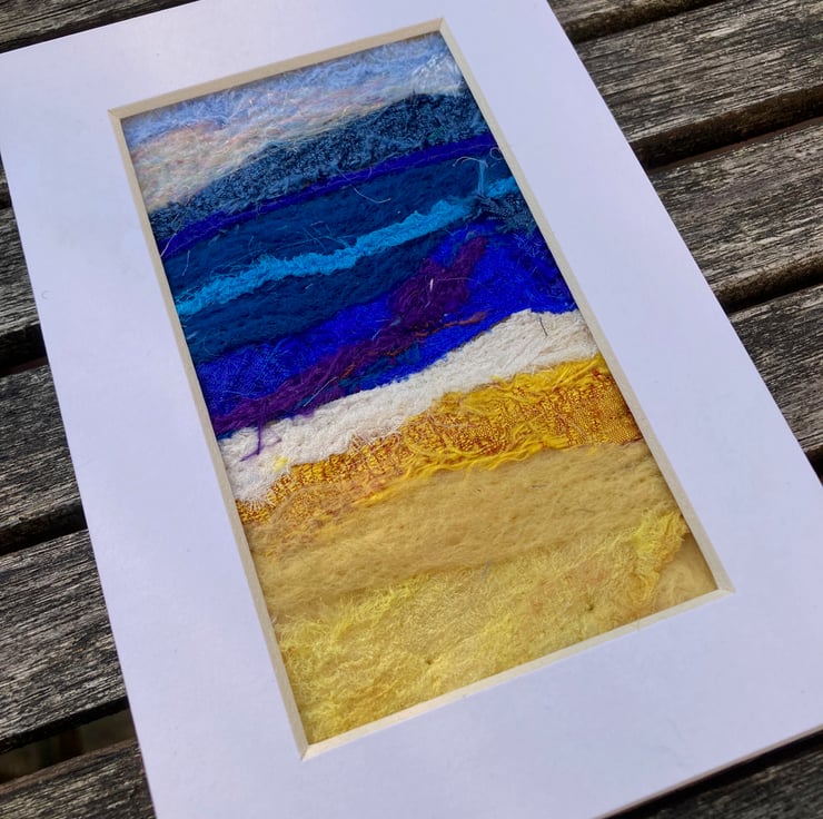 This delightful picture of a seascape, beach scenehas been made using a needle felting technique. Wool and silk fibres and fabric pieces have been needle felted onto a felt background. Needle felting silk fabrics results in a fantastic textural effect. The textile piece has been mounted by means of stitching onto a piece of thick card measuring and a white card mount added. The mount is 6"x 4" with a picture area of 4.5" x 2.5". It is ready for framing in a readily available frame. The photographs shows examples of the piece framed but the frame is not included in the listing.