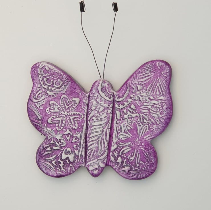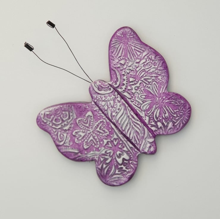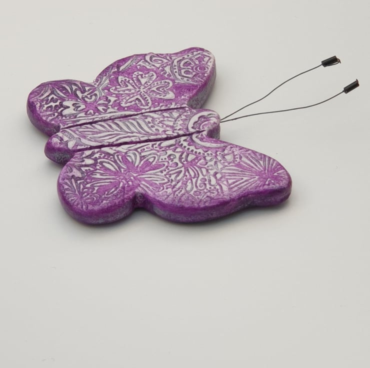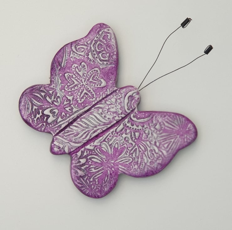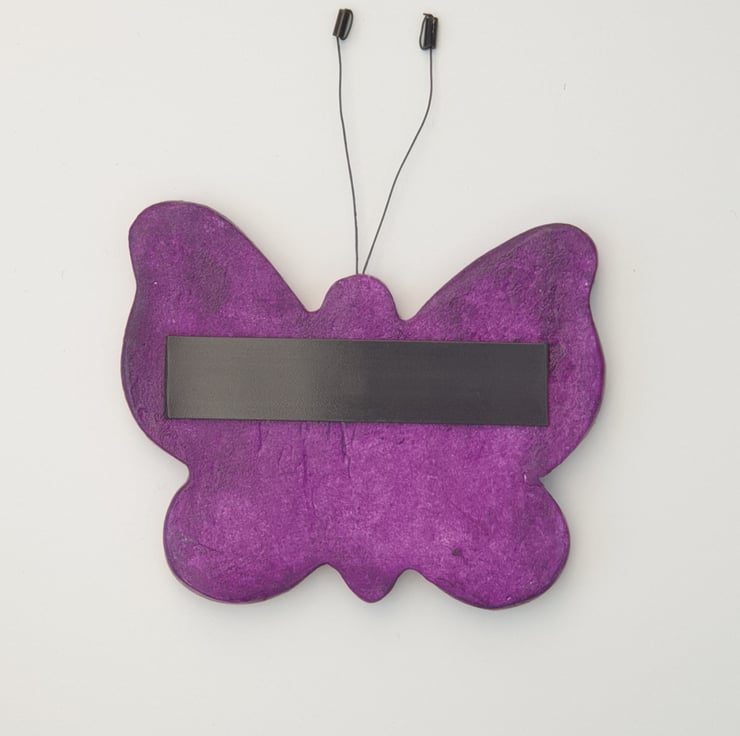 This beautiful butterfly has been handmade from air dry clay and painted with purple, white and silver acrylics and then varnished for protection. The butterfly's antennae have been crafted from wire and beads. A magnet has been attached to the back .