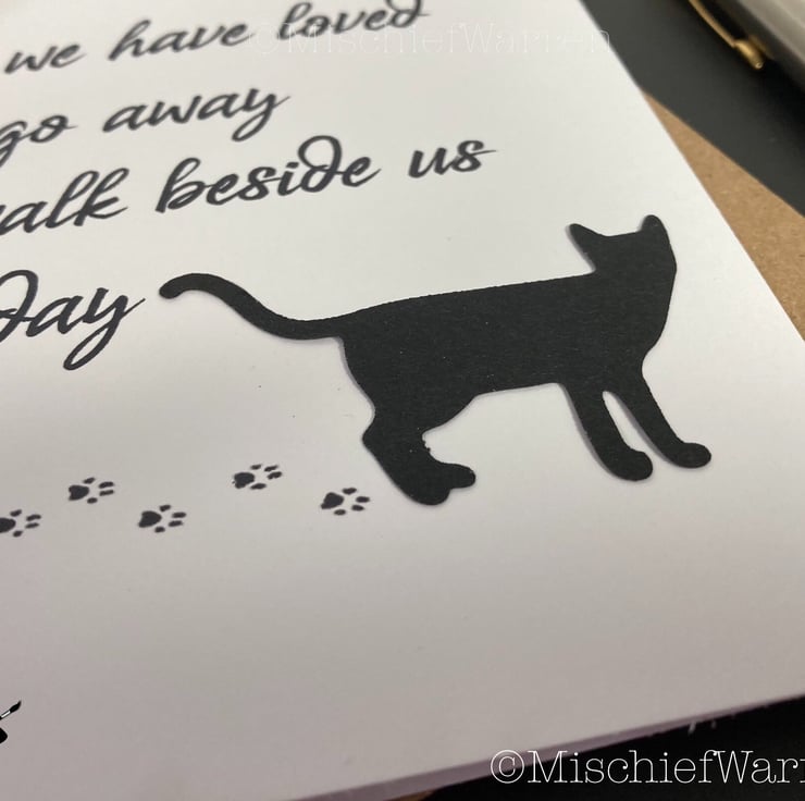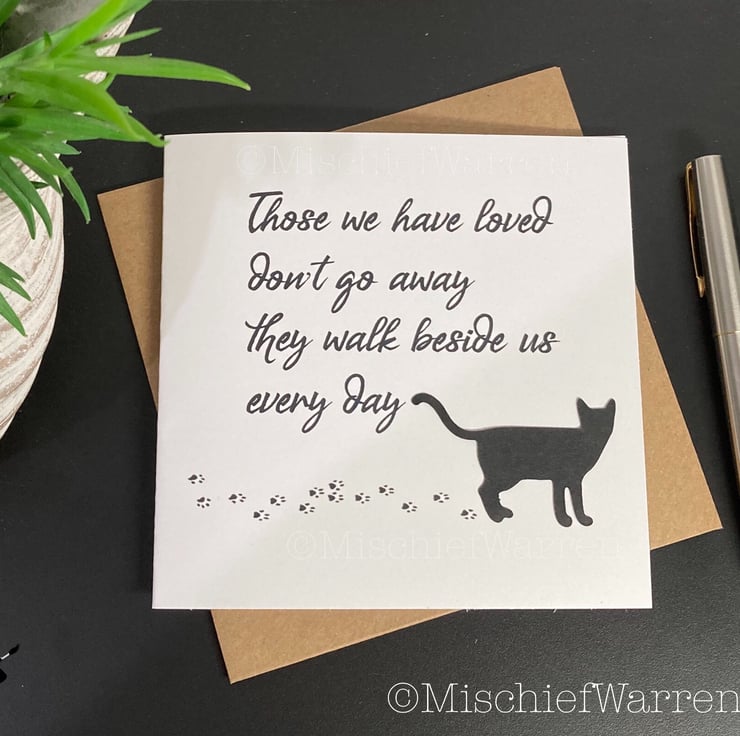 This handmade cat sympathy card, designed and created by me, features paw prints, paper-cut cat silhouette and comforting text for a cat owner suffering loss. If you’re short on time, I’m happy to write your message on the inside and send direct to the recipient. The matt white card is square and comes complete with 6” (15cm) square recycled paper envelope.