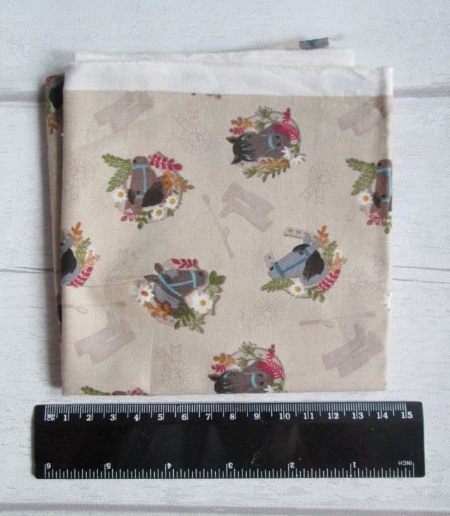 A fat quarter of Lewis & Irene's Farley Mount quilting cotton featuring a print of horse's heads on horseshoe wreaths, rosettes and riding boots on a dark cream/buff background.