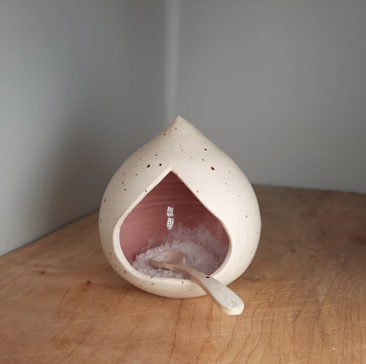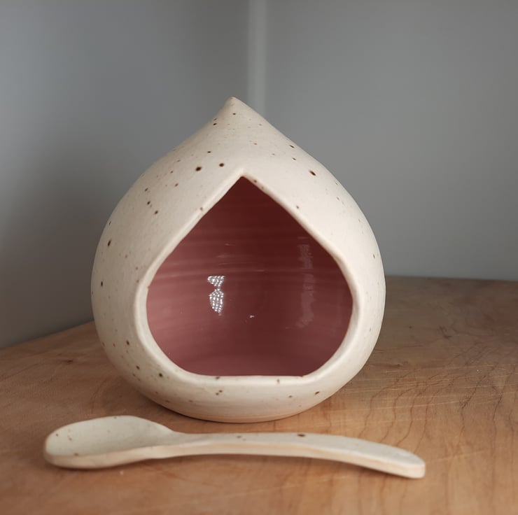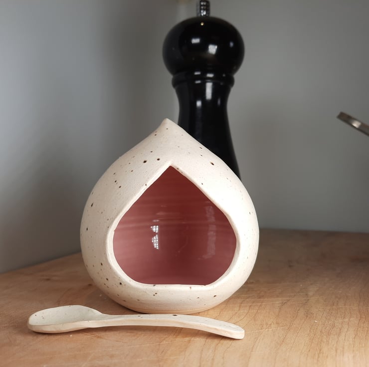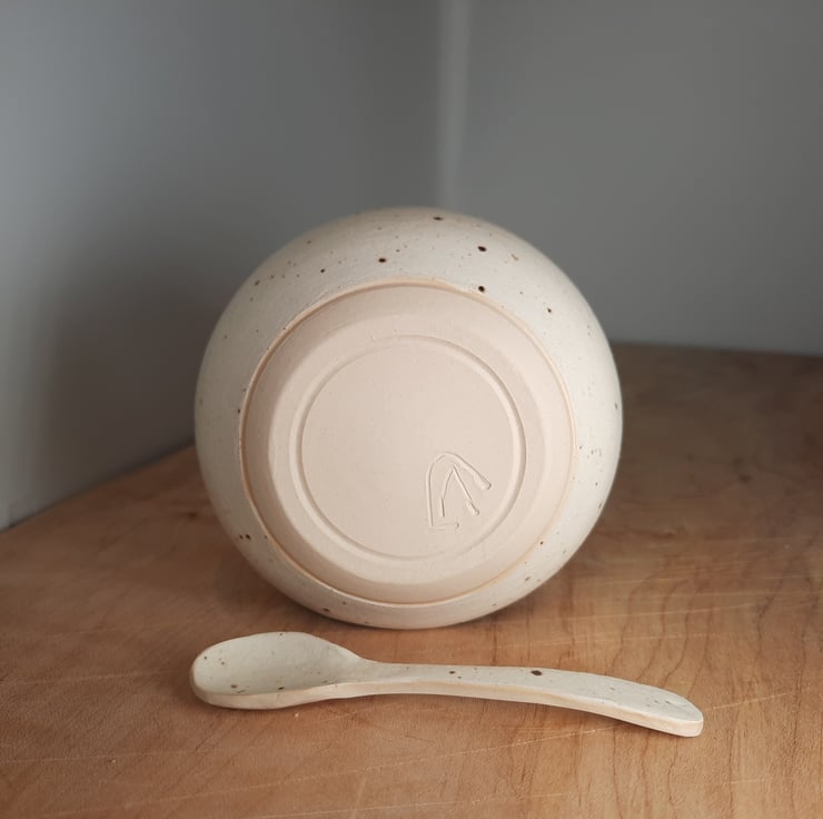 It has been thrown from a white stoneware clay and fired to a high temperature, making it a durable kitchen piece. The spoon is also hand made with the same cream speckle glaze