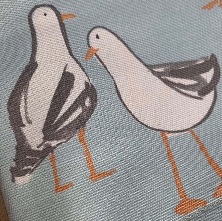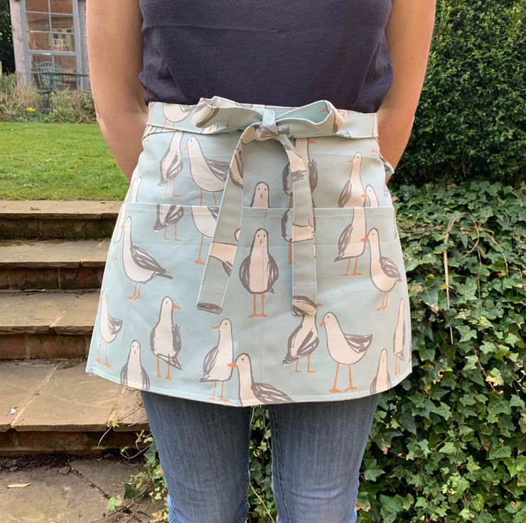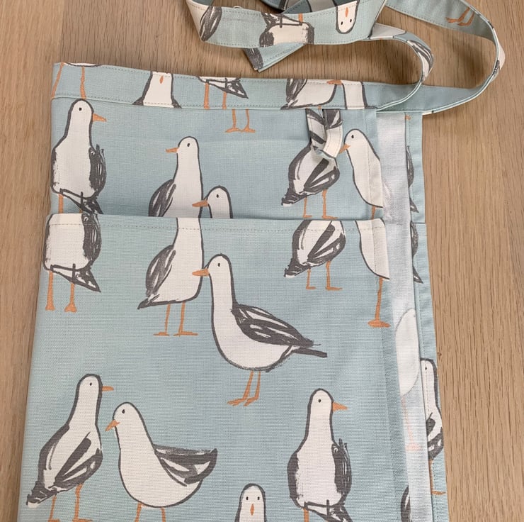 Handy half apron with 2 big pockets in thick pale blue cotton with seagull print.
