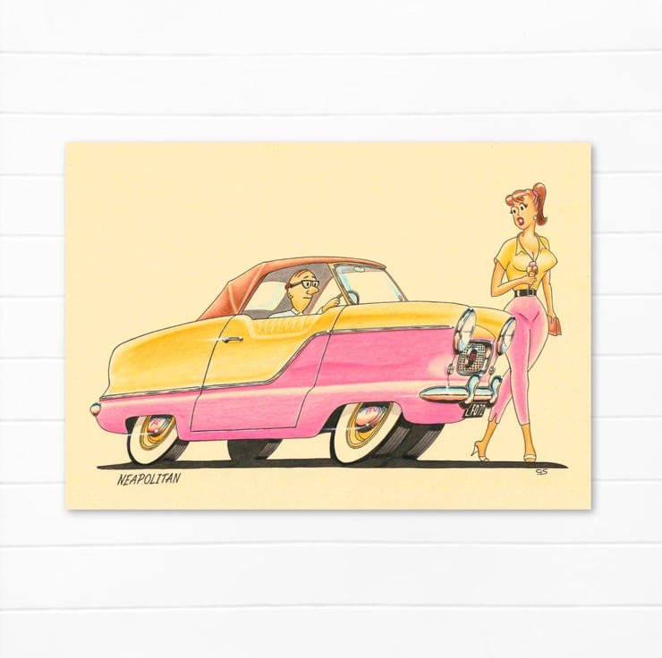 A fifties inspired hand drawn pencil illustration of a popular car and a matching woman with her ice cream.