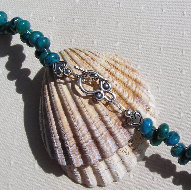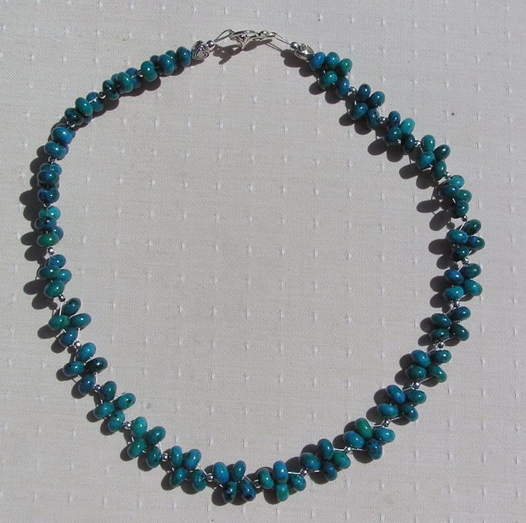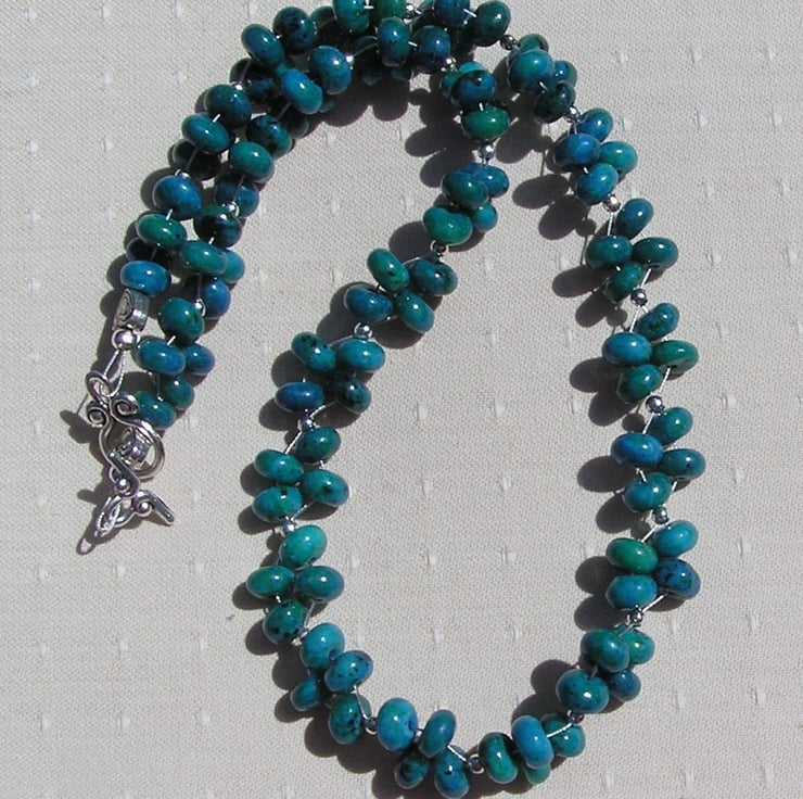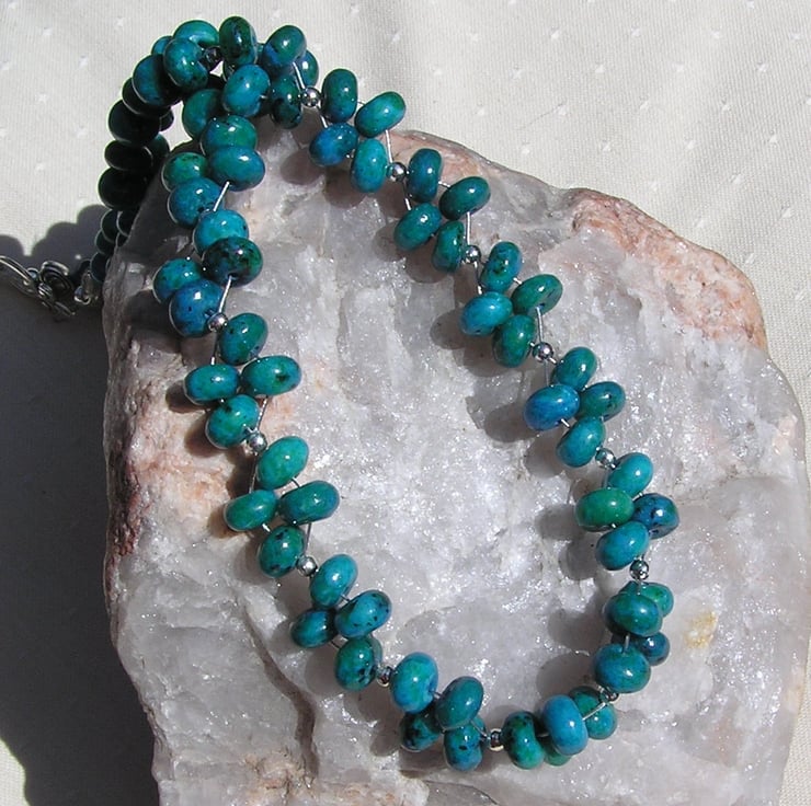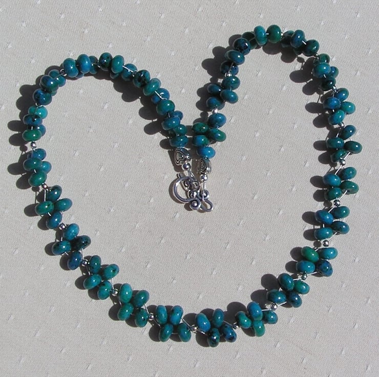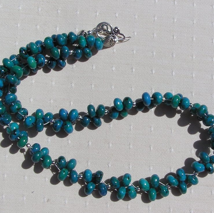 This Stunning Necklace is made wholly from Chrysocolla rondelle beads clustered together in four's and for that added bit of sparkle tiny Silver spacer beads - a Cascade of Teal that will look stunning either worn casually or with something more Elegant for a Special Evening out