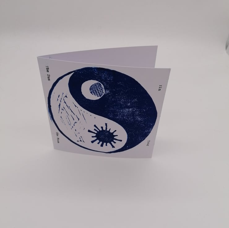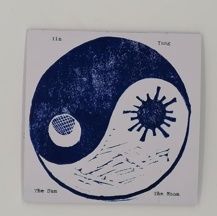 This card says "Yin Yang, The Sun, The Moon", original handprinted Linocut and typewriter.