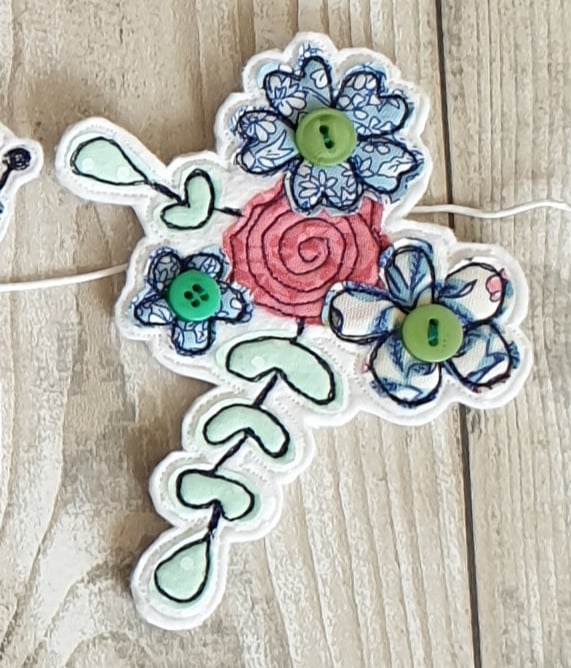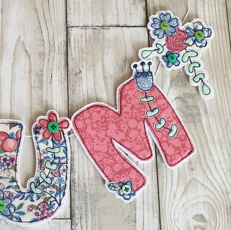 A beautiful handmade garland to show your Mum how special she is. Lovely quality Liberty fabric sewn on to a wool felt backing using free motion machine embroidery. Each letter is decorated with spring flowers and ditsy little buttons. There is a pretty little bouquet of spring flowers and tiny buttons at each end.
