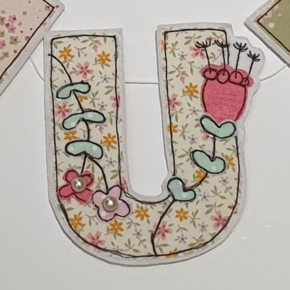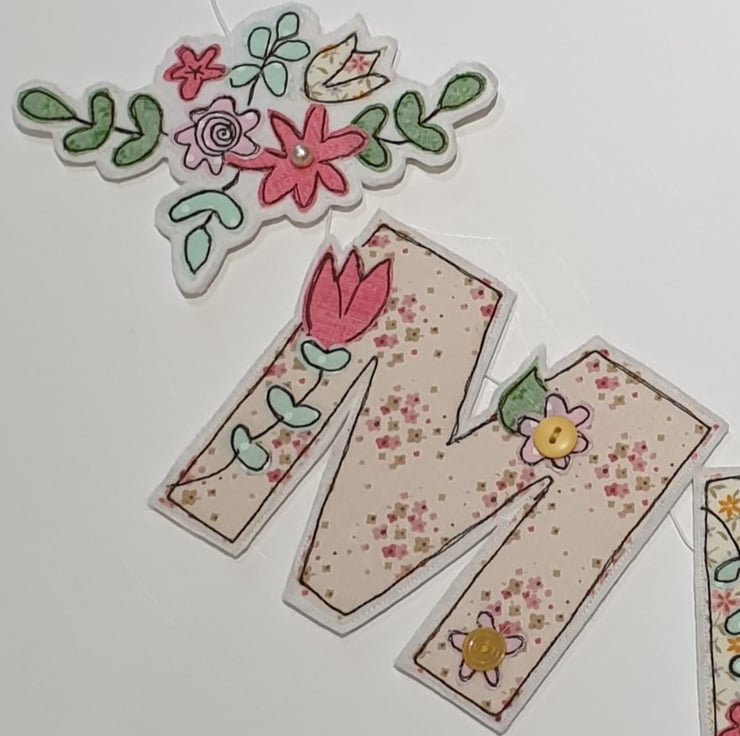 A beautiful handmade garland to show your Mum how special she is. Lovely quality cotton fabric sewn on to a wool felt backing using free motion machine embroidery. Each letter is decorated with spring flowers and ditsy little buttons and pearls. There is a pretty little bouquet of spring flowers and tiny buttons at each end.