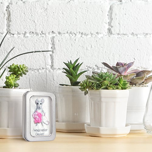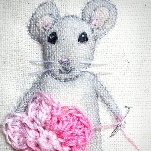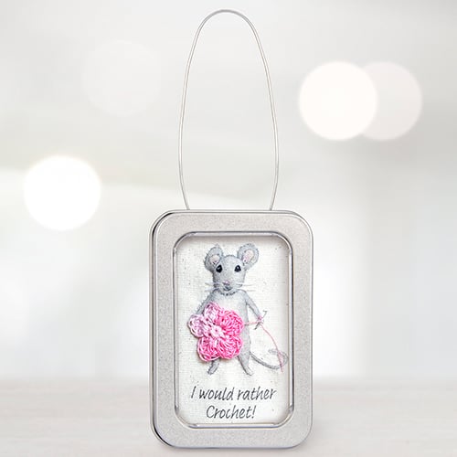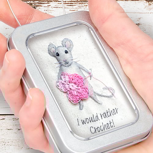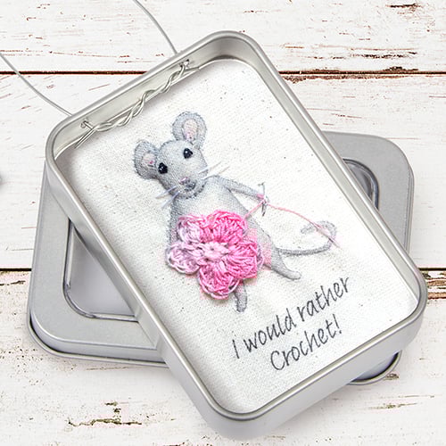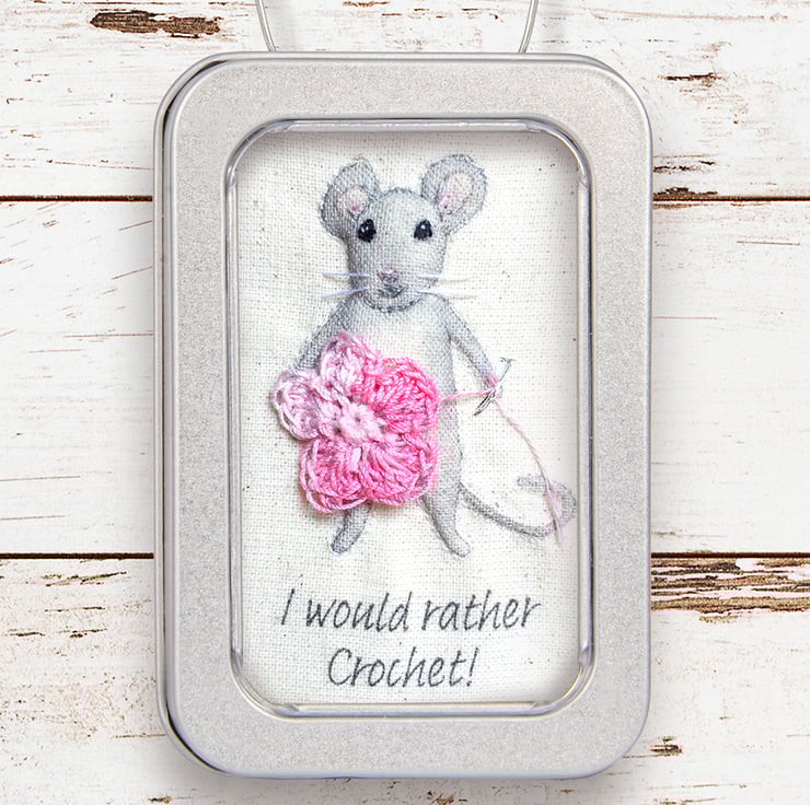"I would rather Crochet!" little mouse, holding a crochet flower, hand embellished, textile print - stitched and framed in a tin, with a loop to hang it up