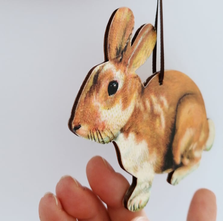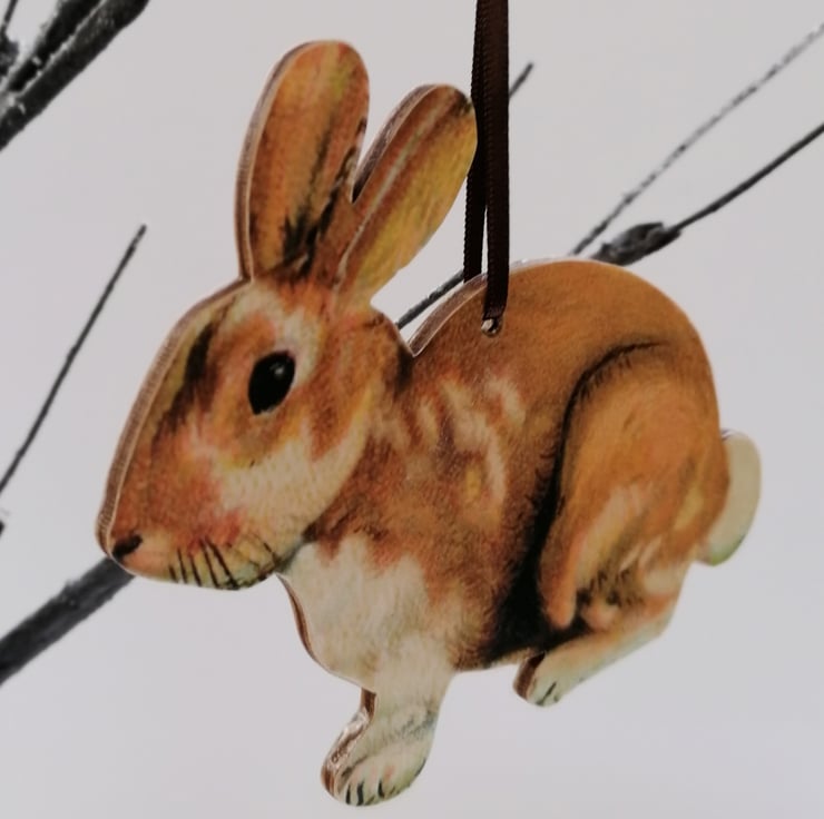 The precision cut rabbit is strung with 3mm satin ribbon in a deep chocolate brown to compliment the dark wooden edge of the shape. The decoration measures 11.5cm (approximately 4.5”) at the widest point and 10cm (4”) at the tallest part, excluding the ribbon. It is 3mm thick.