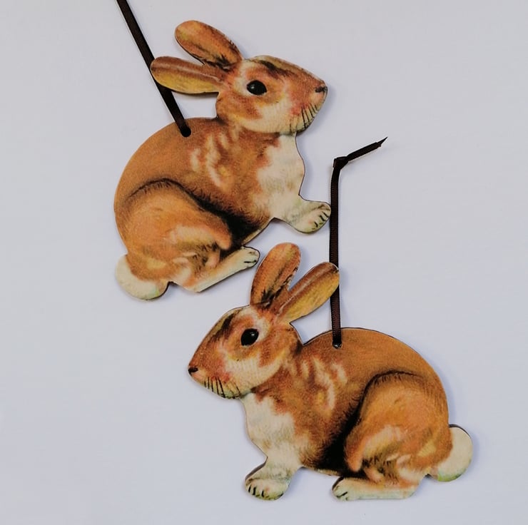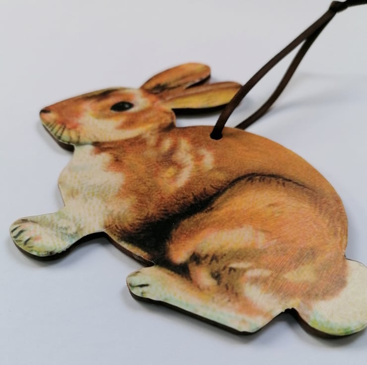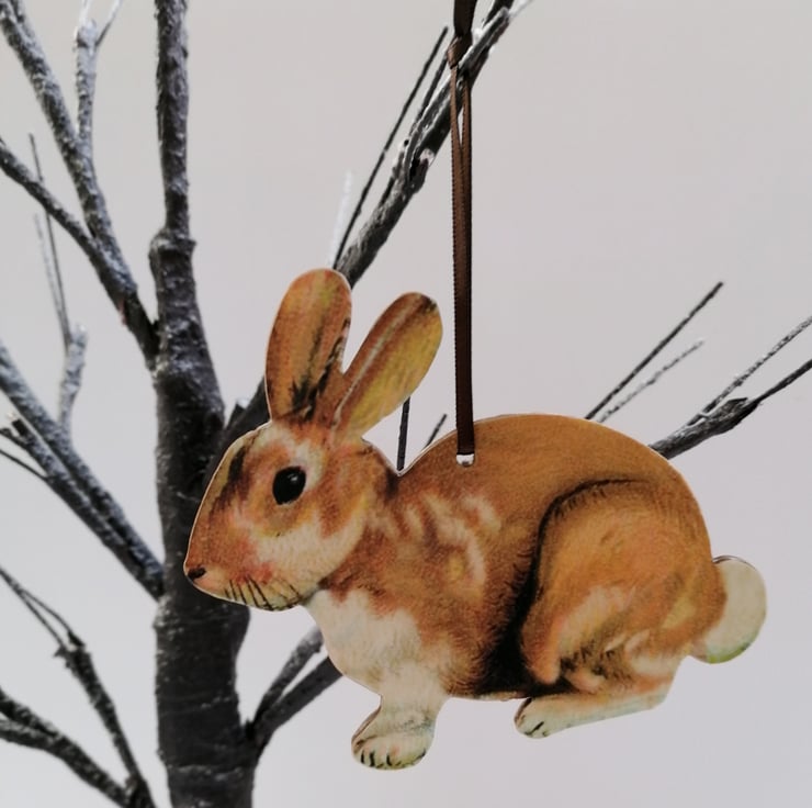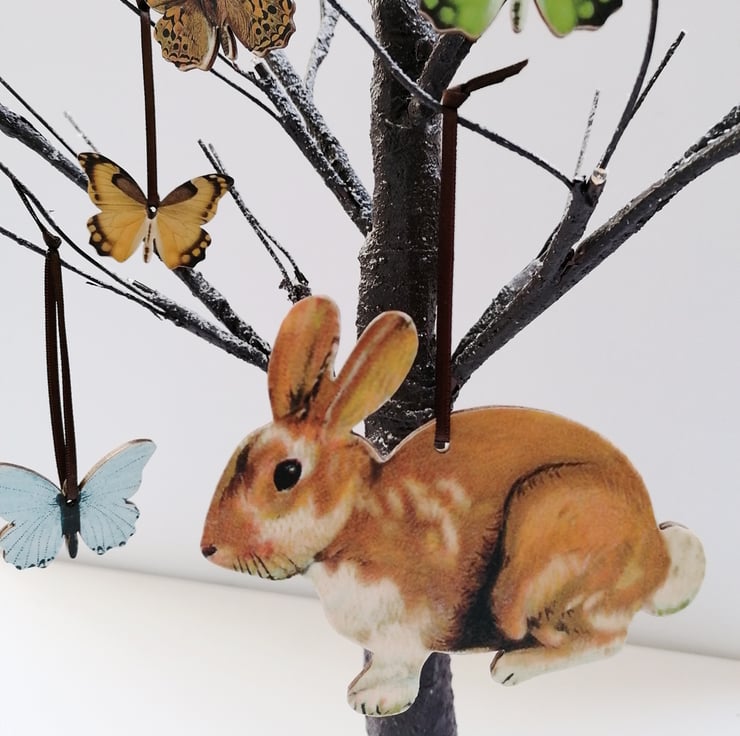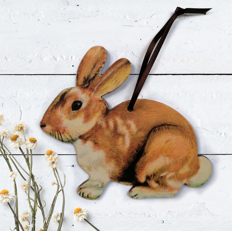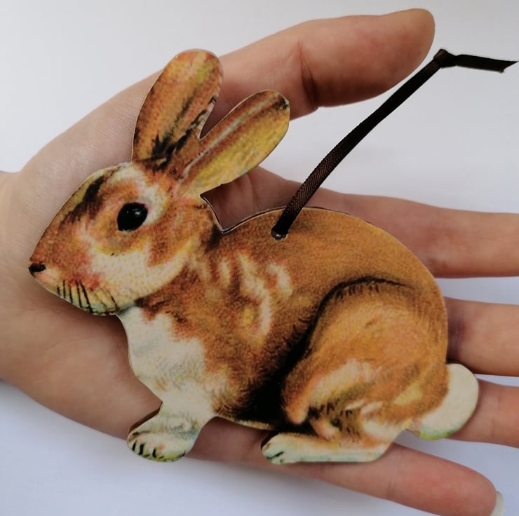 The double sided decoration is handmade from birch wood and features a vintage rabbit image extracted from a Victorian book illustration. The image has been decoupaged onto both sides, and finished with several coats of matt sealant to protect the design.