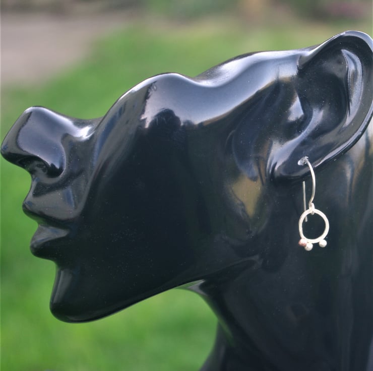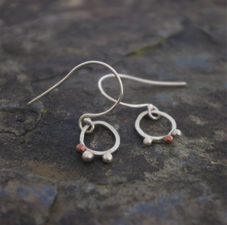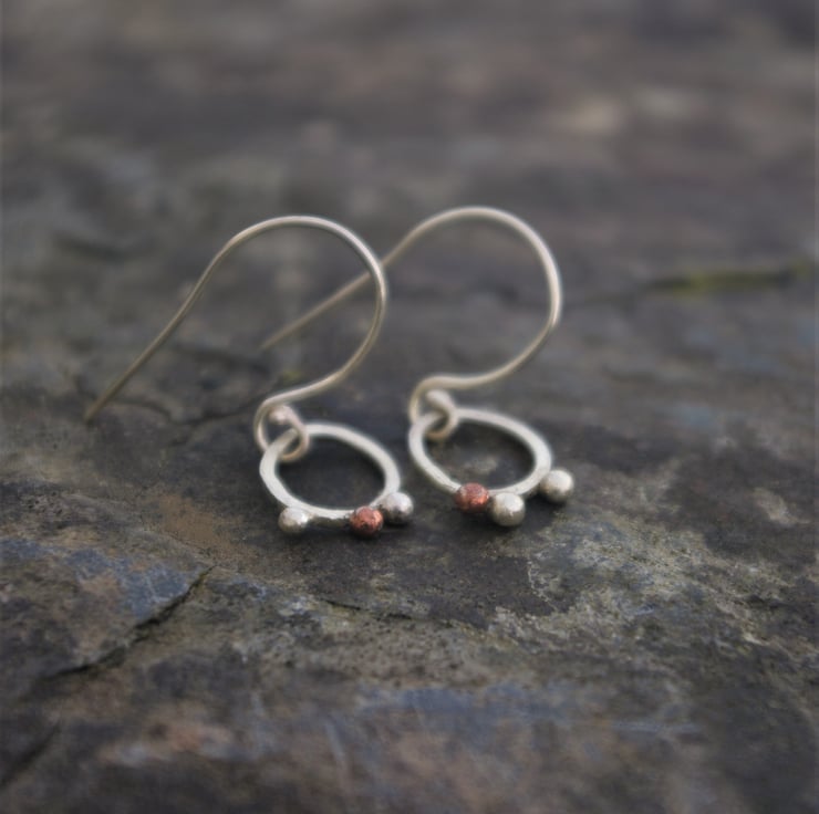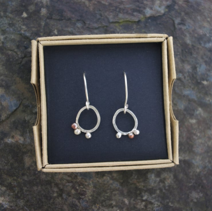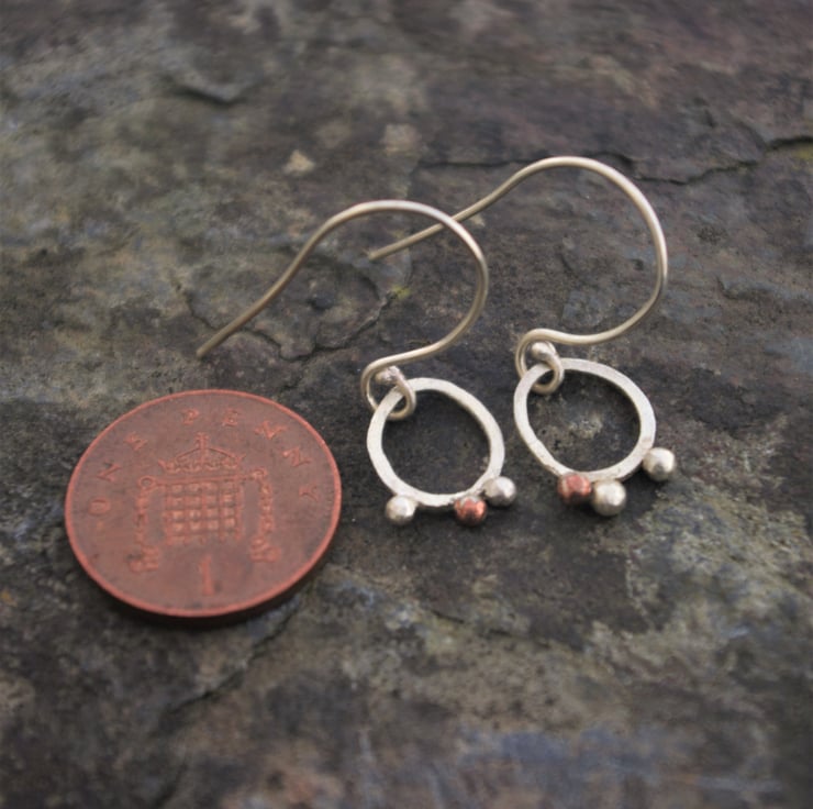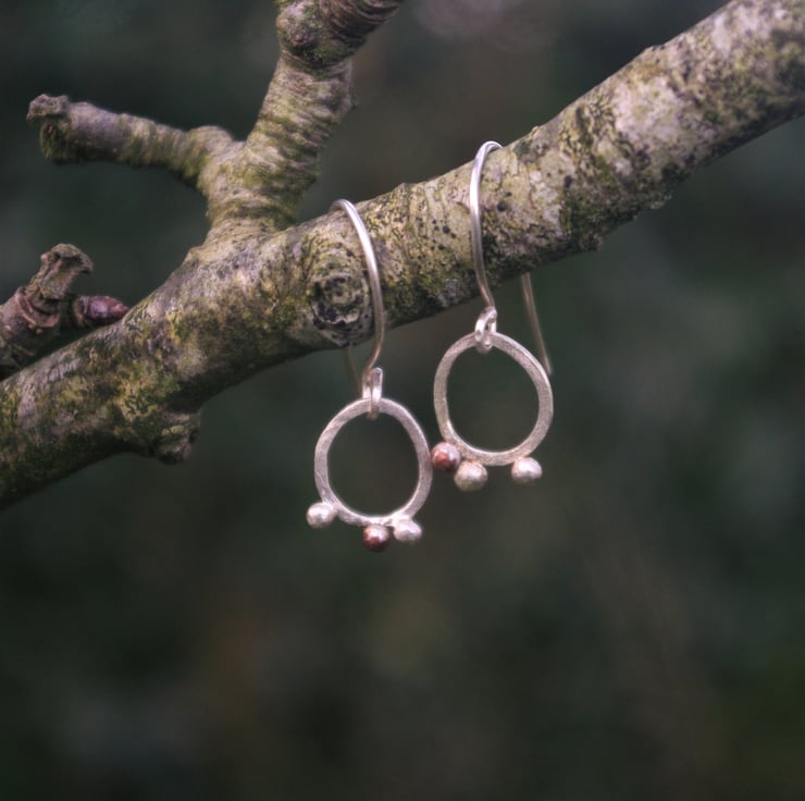 I have soldered eco square silver wire into a small, rough oval shape of width 10mm; length 12mm and added copper and silver 'seeds' clinging to the outer edge at the bottom; made from my left over bits. There's 1 copper seed and 2 silver ones on each earring but they are not symmetrical.