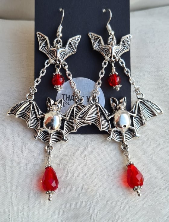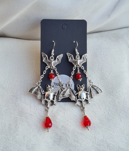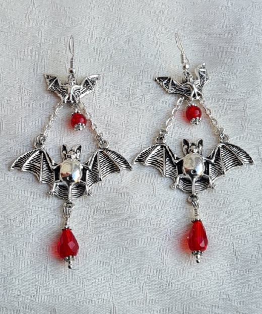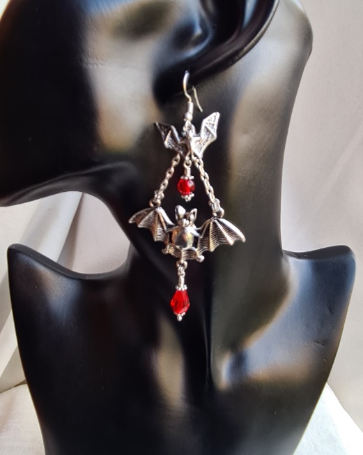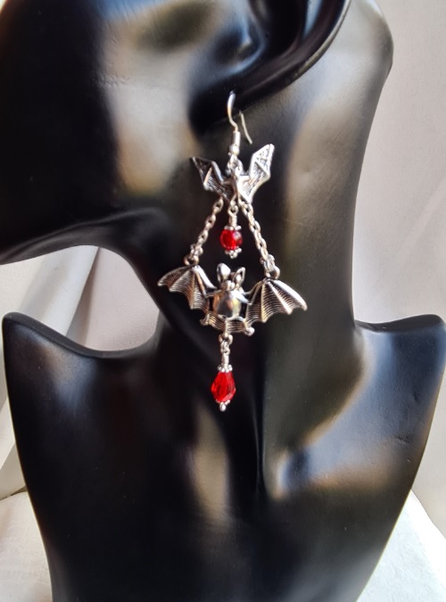 A stunning and ornate pair of creepy-cute Bat earrings. These are quite a large and chunky pair but are oh so gorgeous with Silvery Bat charms and blood red glass beads. Gorgeously gothic and great as a spooky gift.