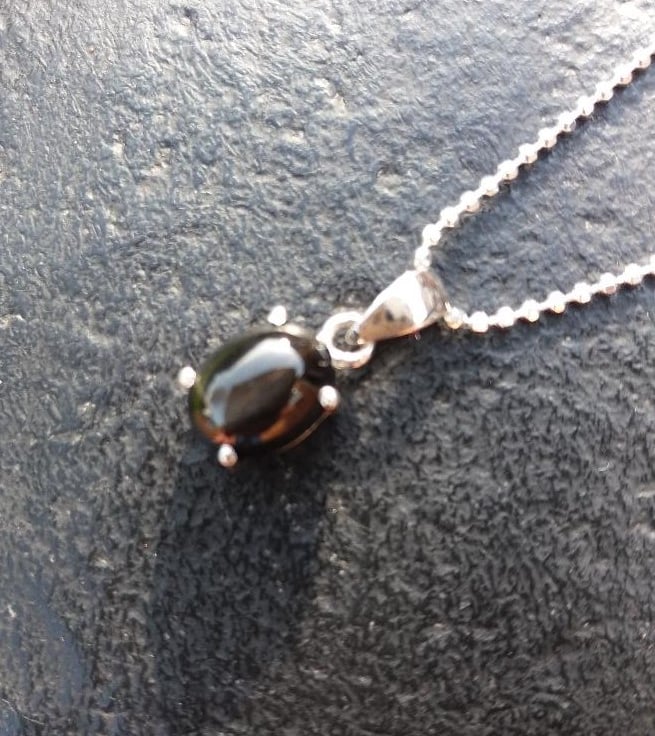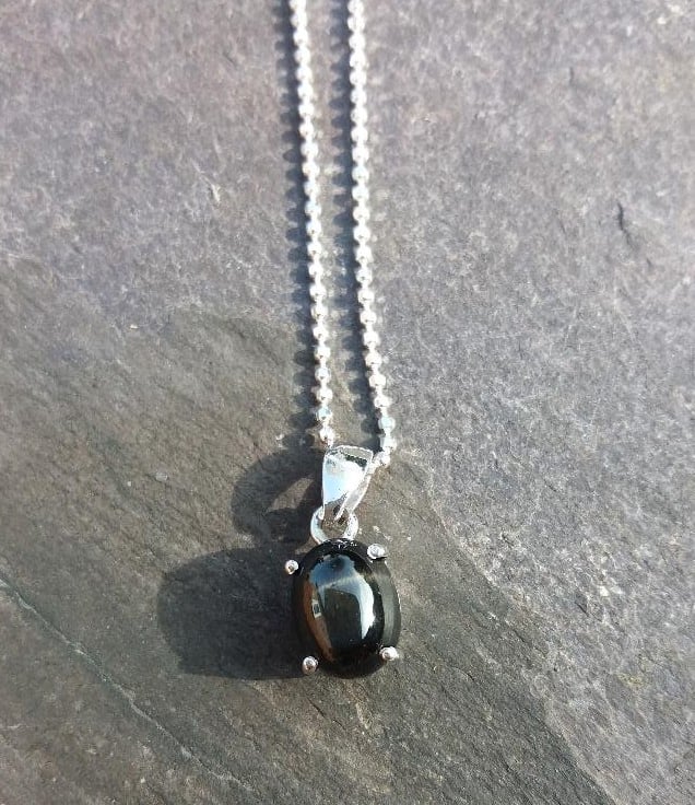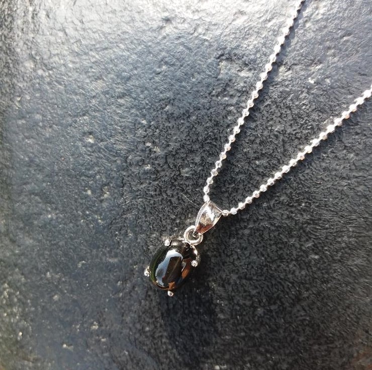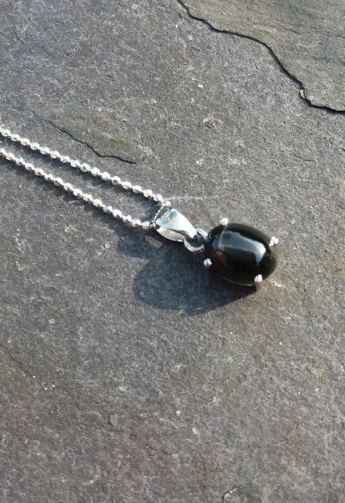 A pretty black onyx star diopside pendant in a setrling silver prong setting. The pendant hangs from a sparkling diamond cut chain finished with a spring clasp. The necklace is 46cm long. The onyx is 8mm x 6mm,