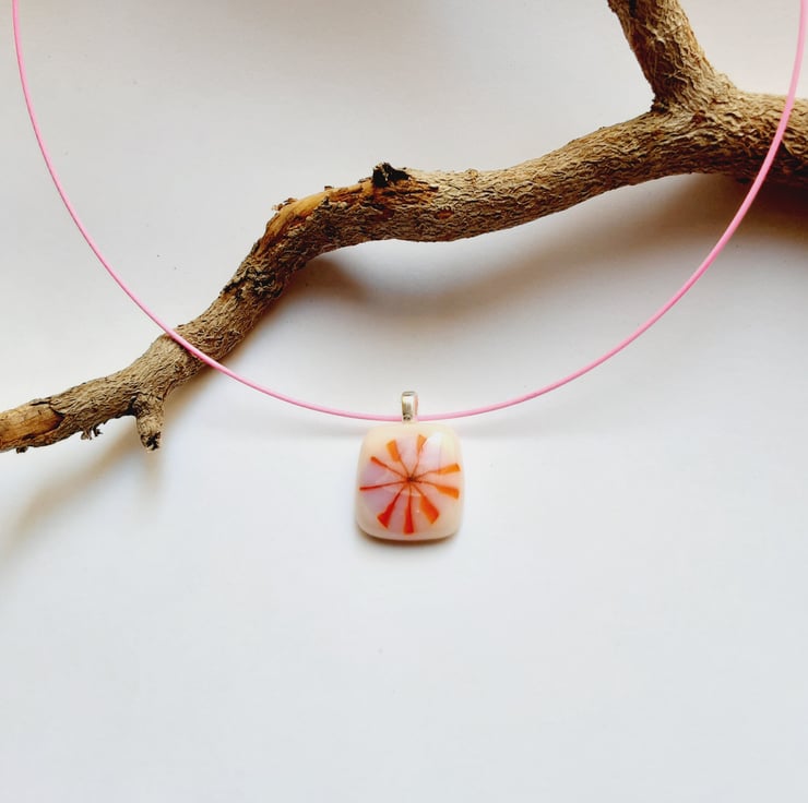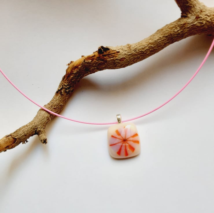 Pretty in pink! This pendant has been made by me fully fusing a sea anemone patterned piece of murrine onto pale pink Bullseye glass. It comes on a pink memory wire 18" choker with a screw clasp.