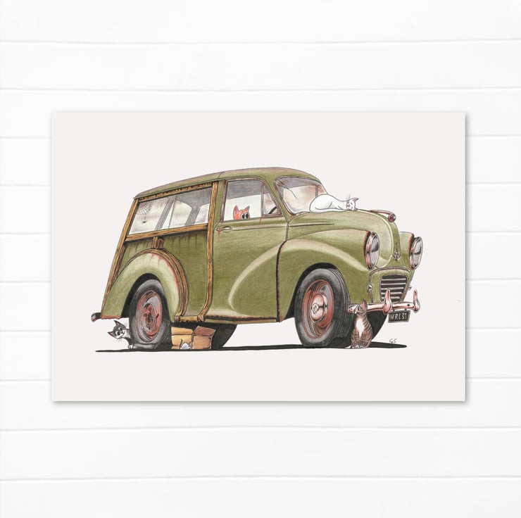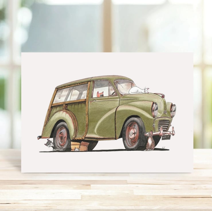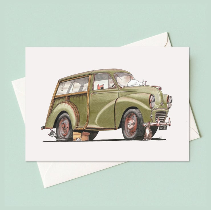 Moggies Greetings Card: Classic Morris Traveller and Cute Cats (324)