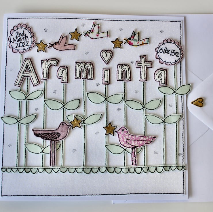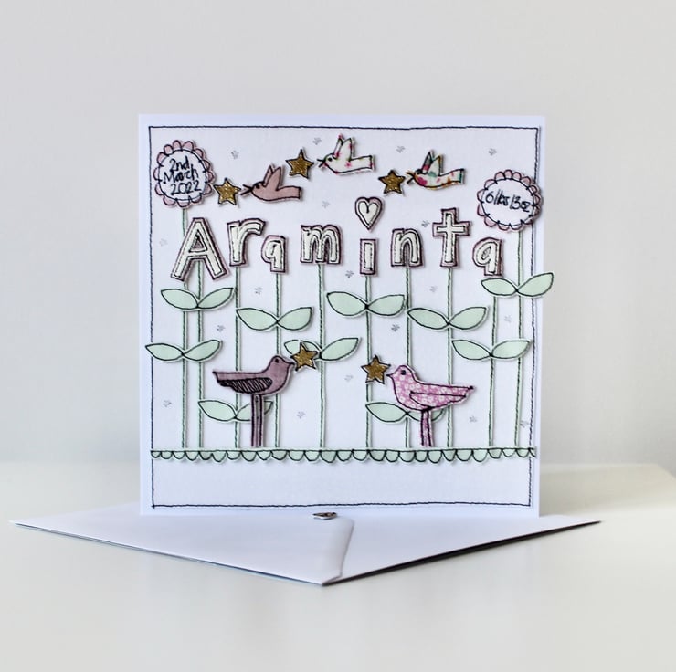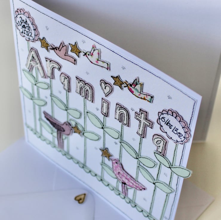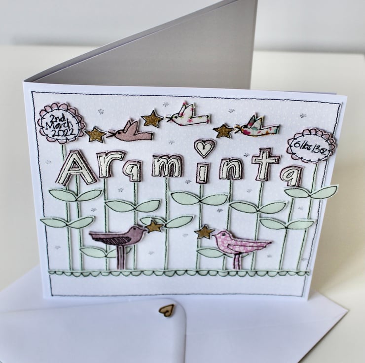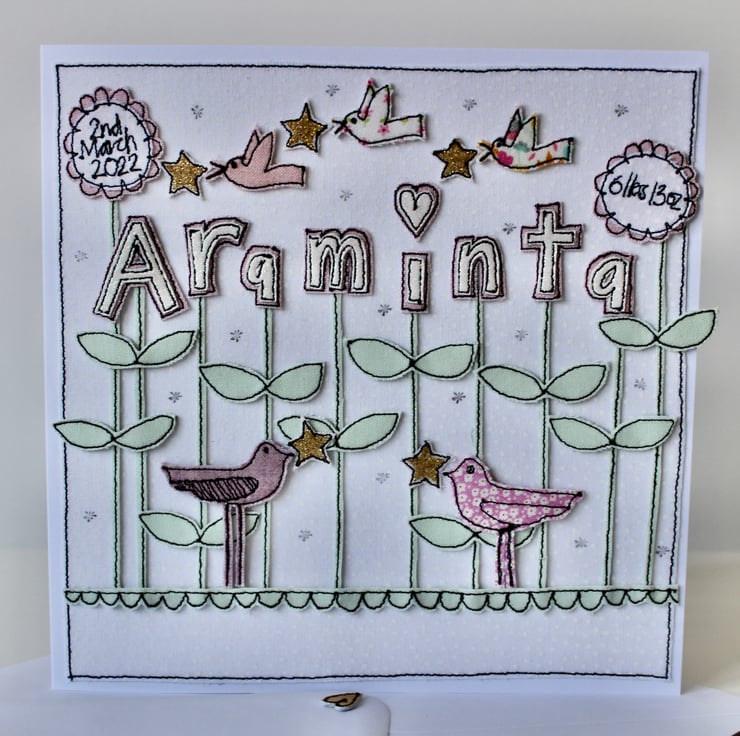 A new baby card which includes five birdies, five stars, ten blooms spelling the name 'Araminta' and the birth date and weight.