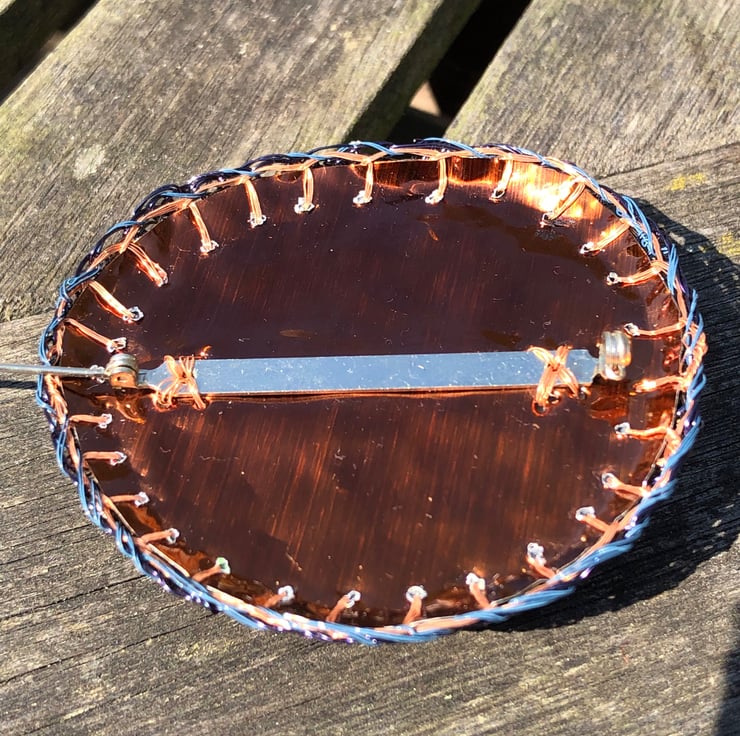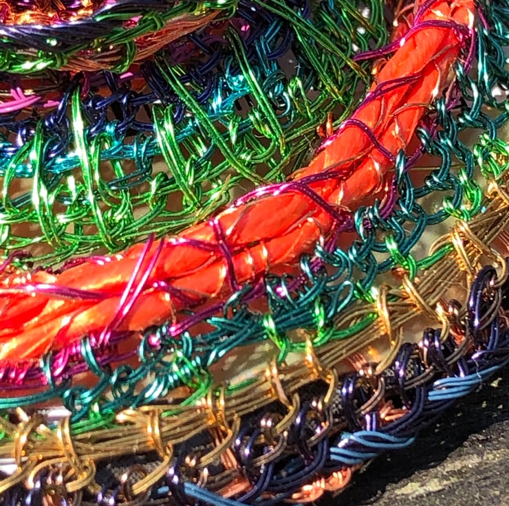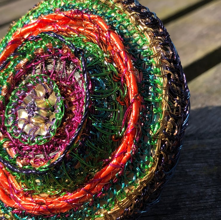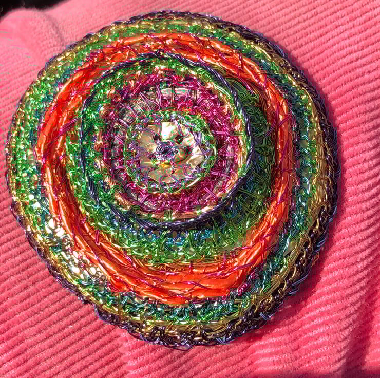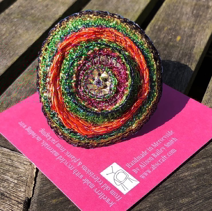 Domed Circle Brooch - inspired by Kandinsky's paintings of circles -made of wire wrapped around recycled plastic ribbon and coiled with a wire stitched edge with plastic packaging used on reverse from tube of conditioner. Made during lockdown in 2020.