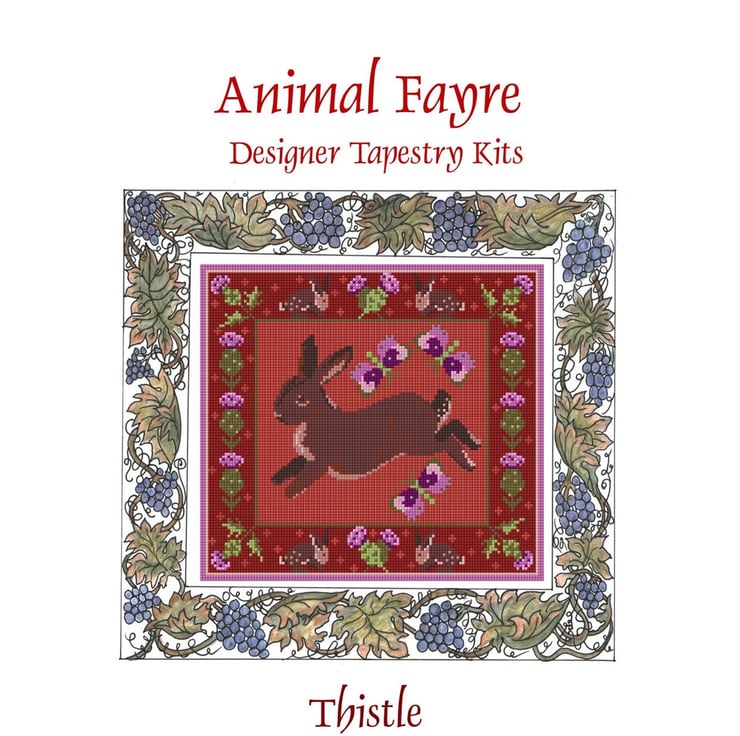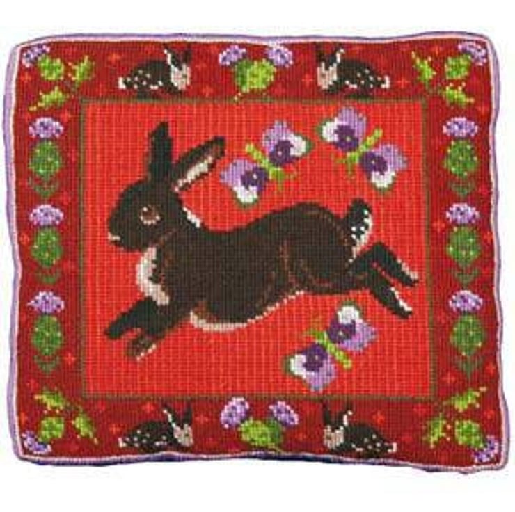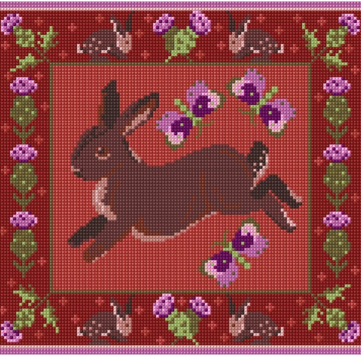 Each bunny design is surrounded by an interesting corresponding flower and rabbit border, picking out the dark shade of the tapestry.