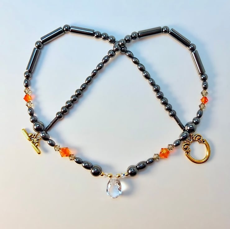 The hematite beads are set with pairs of 6mm and 4mm Swarovski crystals in a colour called "fire opal", each flanked by Swarovski "black diamond" 4mm bicones.