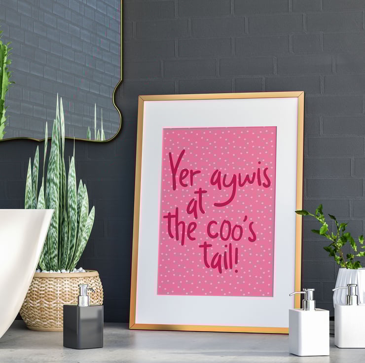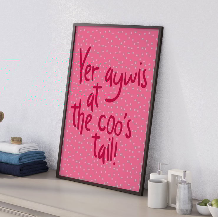 Scottish phrase print: Yer aywis at the coo’s tail!