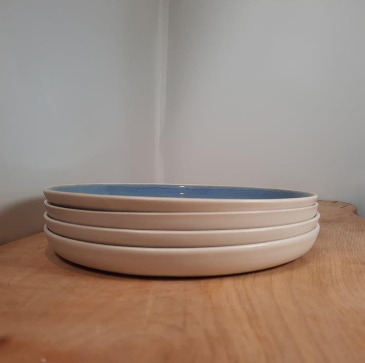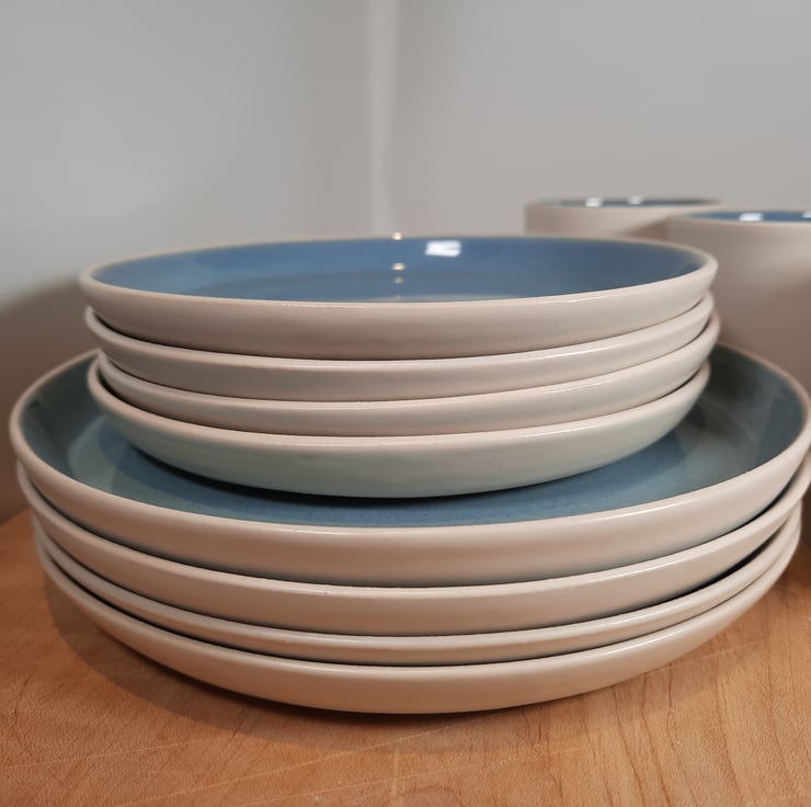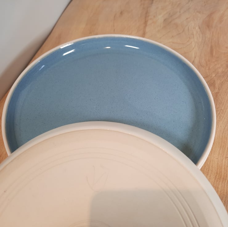 A set of two hand made stoneware plates in blue grey (glossy) and white (satin) glazes. Perfect size for starter or breakfast plates.