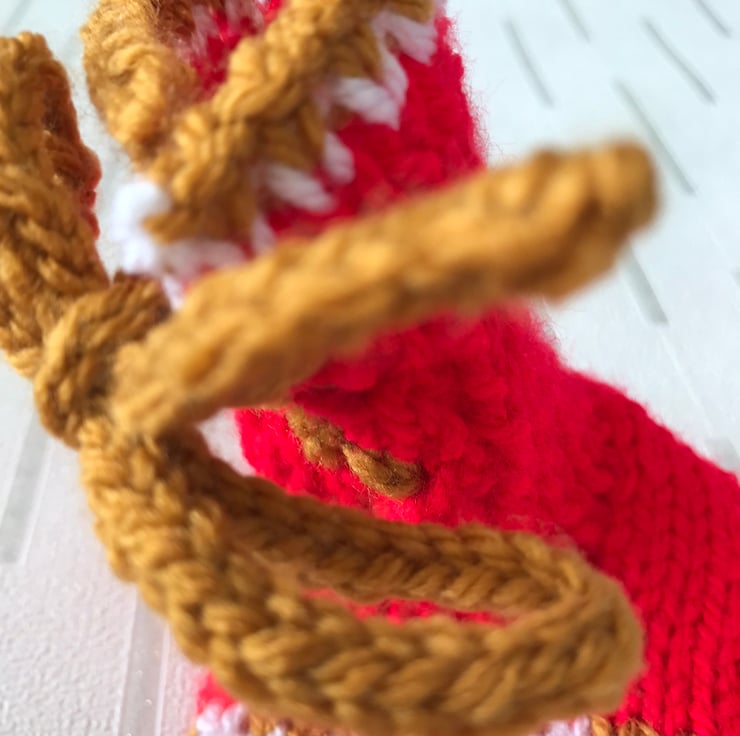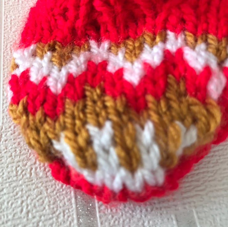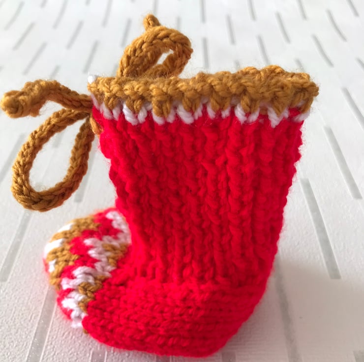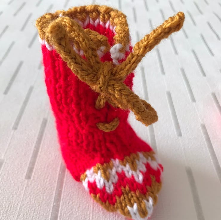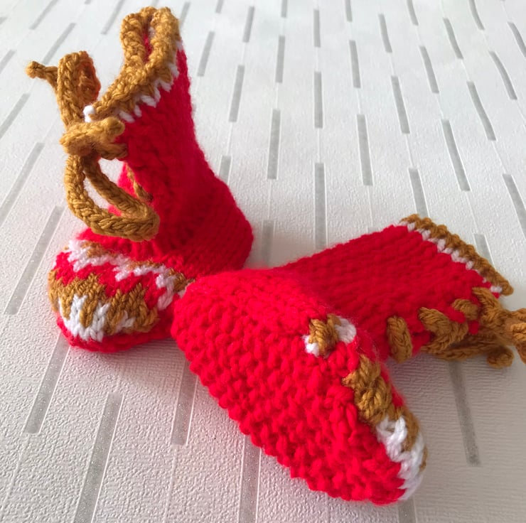 The bootees are worked in red with a fair isle pattern on the front in red, white and gold.
